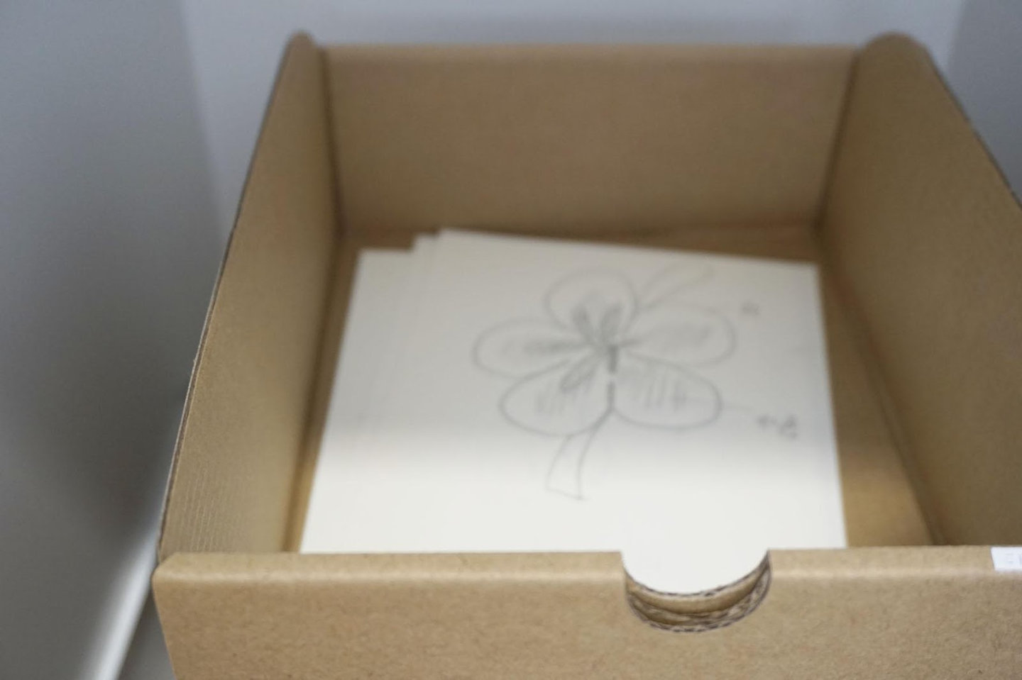 音羽:「初めてこちらに打ち合わせで伺った時にこのストラップのお話を聞いて、ぜひ実物を見てみたいと思ったのですが、現物はもうないということで見ることは叶わなかったです。でも、創業のきっかけとなった象徴的な商品が、もうどこにもないということにとても興味を持ちました。Hamee の仕事の内容はもちろん、人の入れ替わりやオフィスも含め、すごい速さで変化・成長し続けている企業だからこそ、もう見ることができない象徴的なストラップという存在はHamee にとっても重要な存在のように私には思えました。そこで、樋口社長から聞いた情報を頼りに、ハイビスカスのストラップの化石のようなイメージで私がオブジェを作りまして、それを段ボールの引き出しに入れて、社屋のロッカーの1 つに展示しました。そのストラップが作られた年の1998のナンバーで開くように設定していて、オープンスタジオに来てくれた社員さんで、ハイビスカスのストラップのスケッチ…それぞれの遠い記憶の中、あるいは想像の中のスケッチを描いてくれた人に、ロックナンバーを教えて、化石の入っているロッカーの中に積み重ねるように入れてもらいました。」