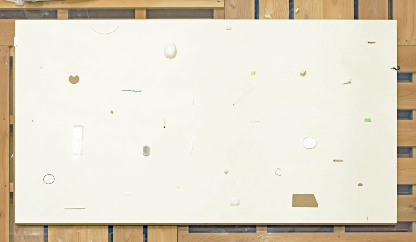音羽:「日用品の断片を配置してみては崩して、また配置し直すっていうのを何度も繰り返していました。オープンスタジオが終わっても何度も取ったり付けたりを繰り返している期間が長かったのですが、何か画面に変化がある度に社員さん達が「今度こそ完成?」「風景にみえる」「基盤にみえる」と色々と声をかけてくださっていました。