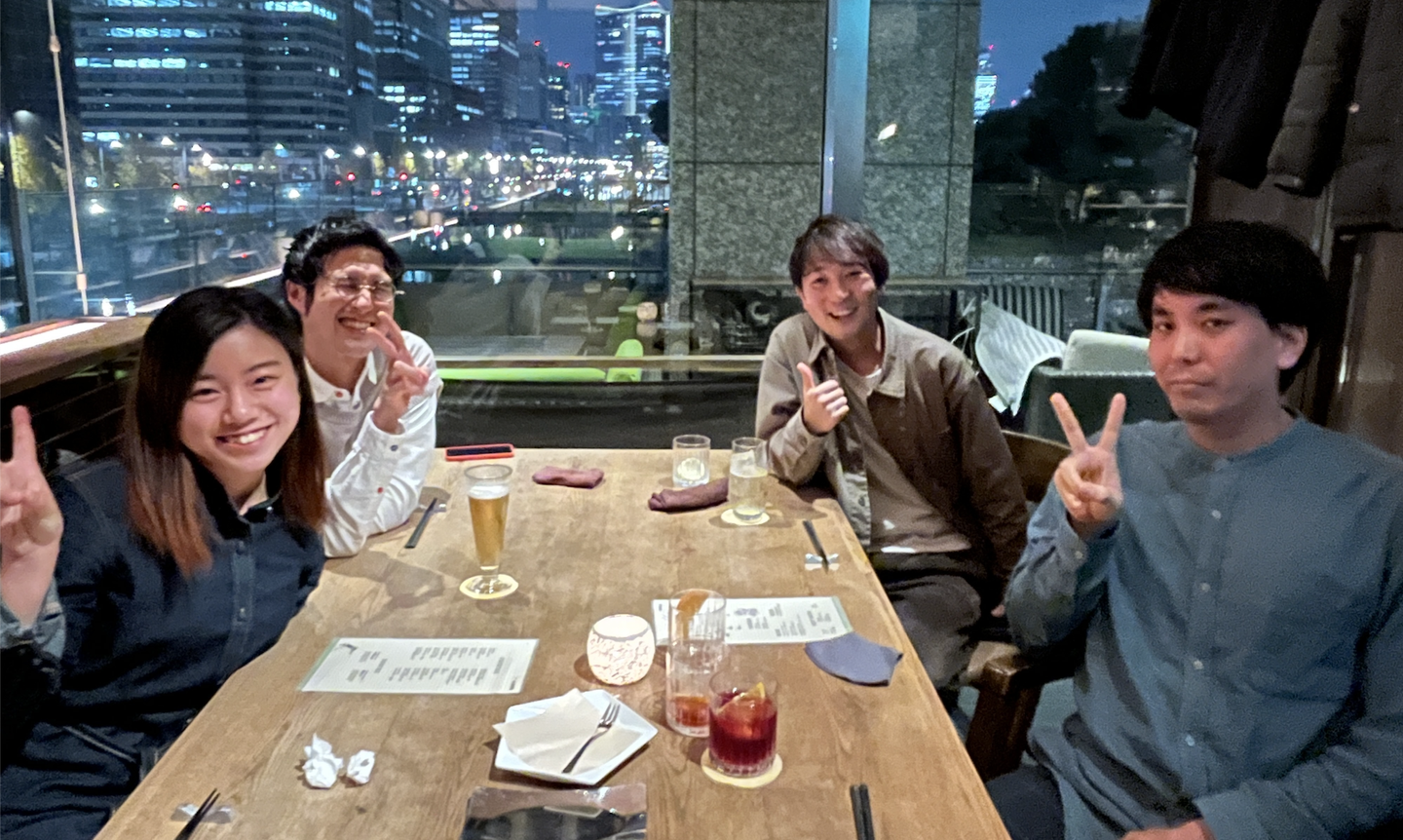 入社1年記念を代表がお祝いするアニバーサリーディナー制度があります。入社からの1年間を美味しいディナーとお酒をたしなみながら振り返る、そんな時間を過ごしています。現在はメンバーも増えたため、クオーター毎にメンバー数名で実施しています。メンバー間の仲も深まる貴重な時間になっています!「これ食べたい!」「このお店行きたい!」などわがまま言っていただいてかまいません。きっと代表が期待に応えてくれる……はずです。