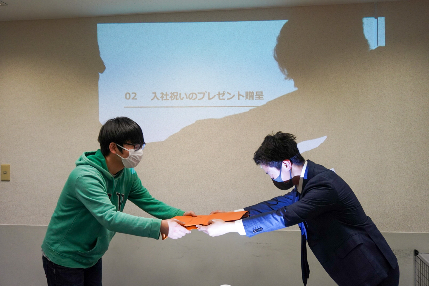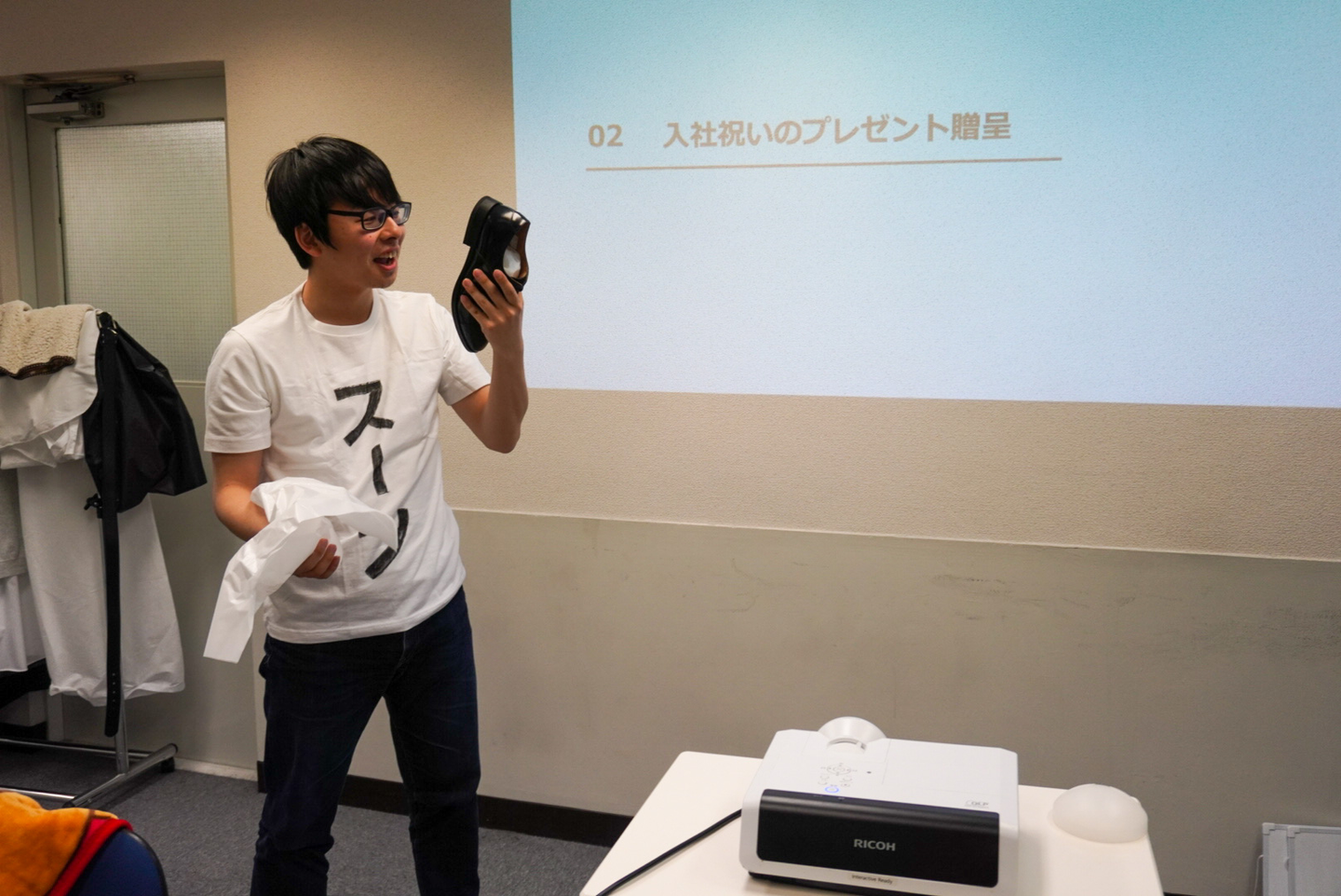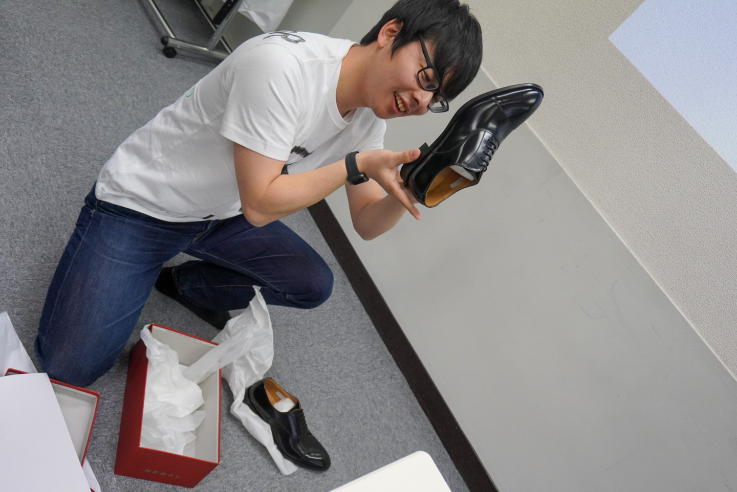 以前、凱人くんが「革靴がほしい」といっていたのを代表が覚えていて、入社記念にみんなからプレゼントすることにしたんです!