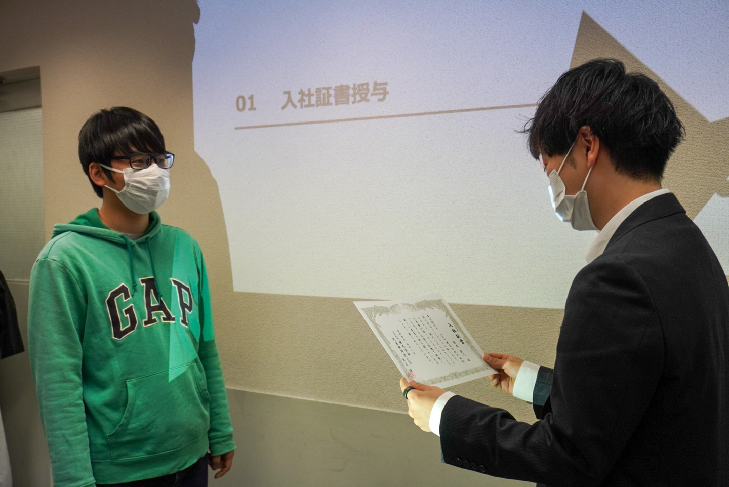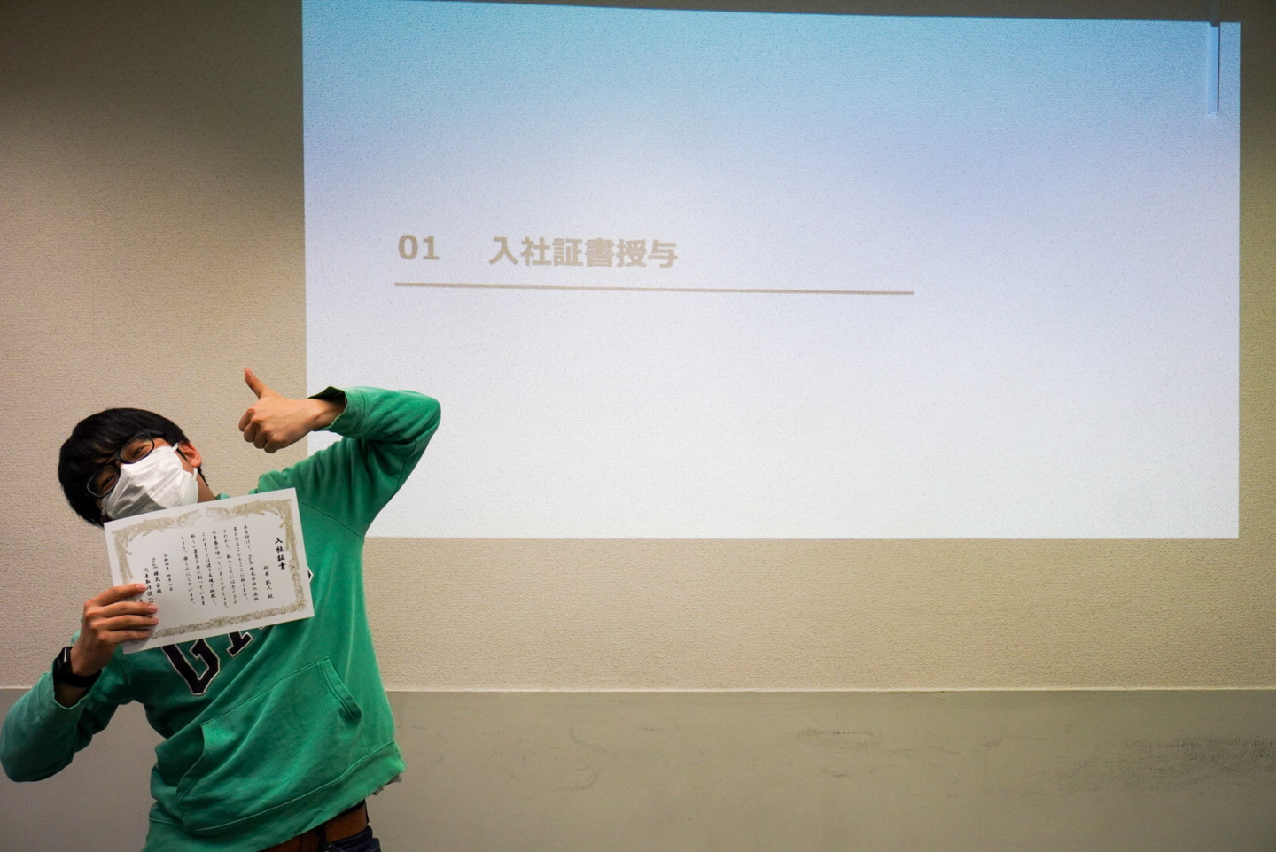 まずは、代表 大上から入社証書授与。