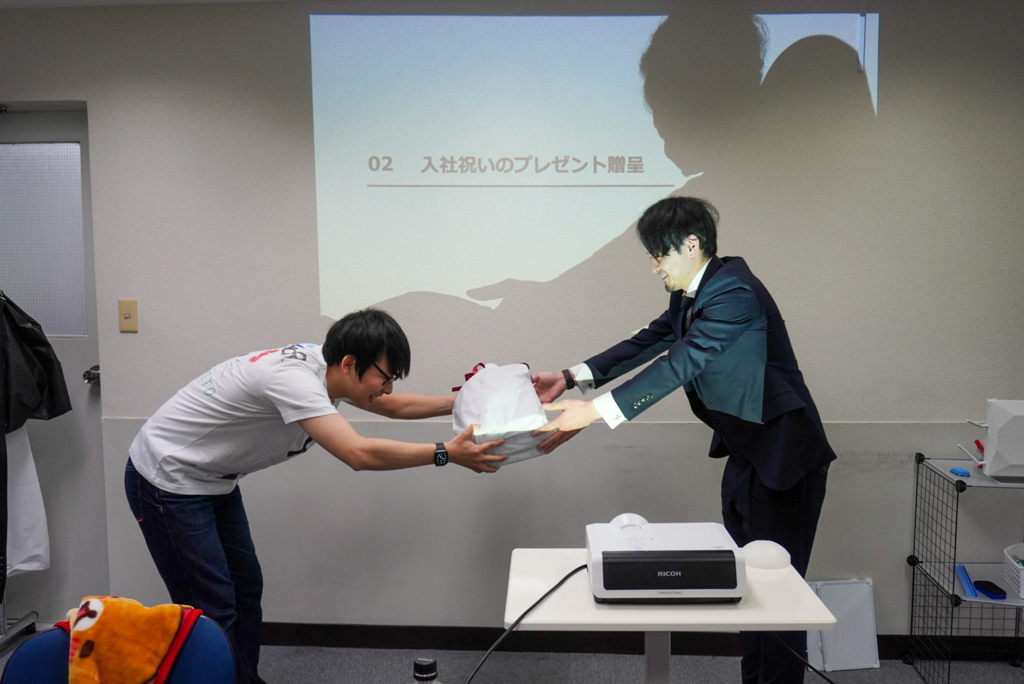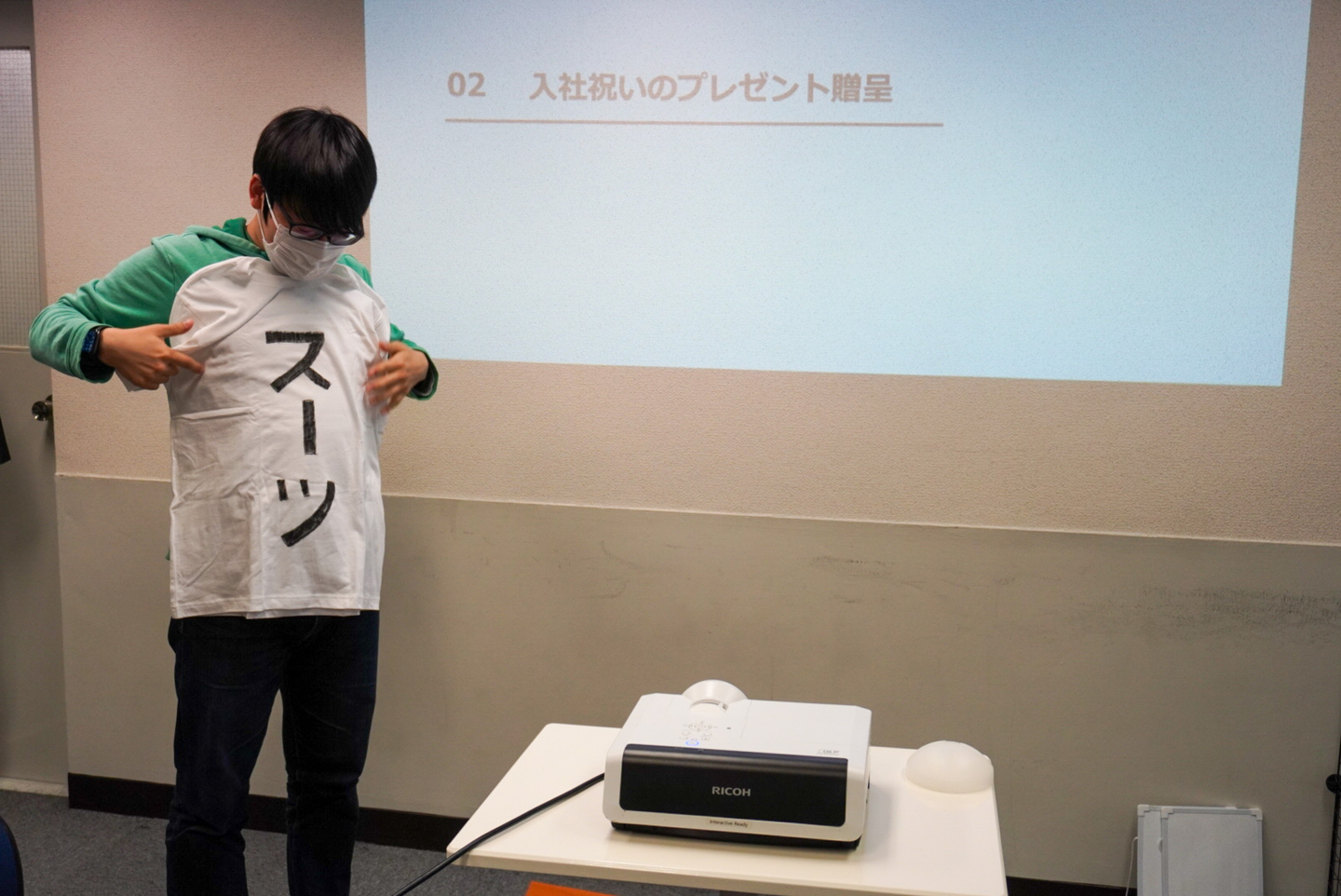 ※集合写真でスーツTシャツは可哀想なので、オフィスにあるスーツに着替えるように伝えると「こっちがいいです!」という凱人くん。なんだかんだこっちも喜んでくれてよかった!