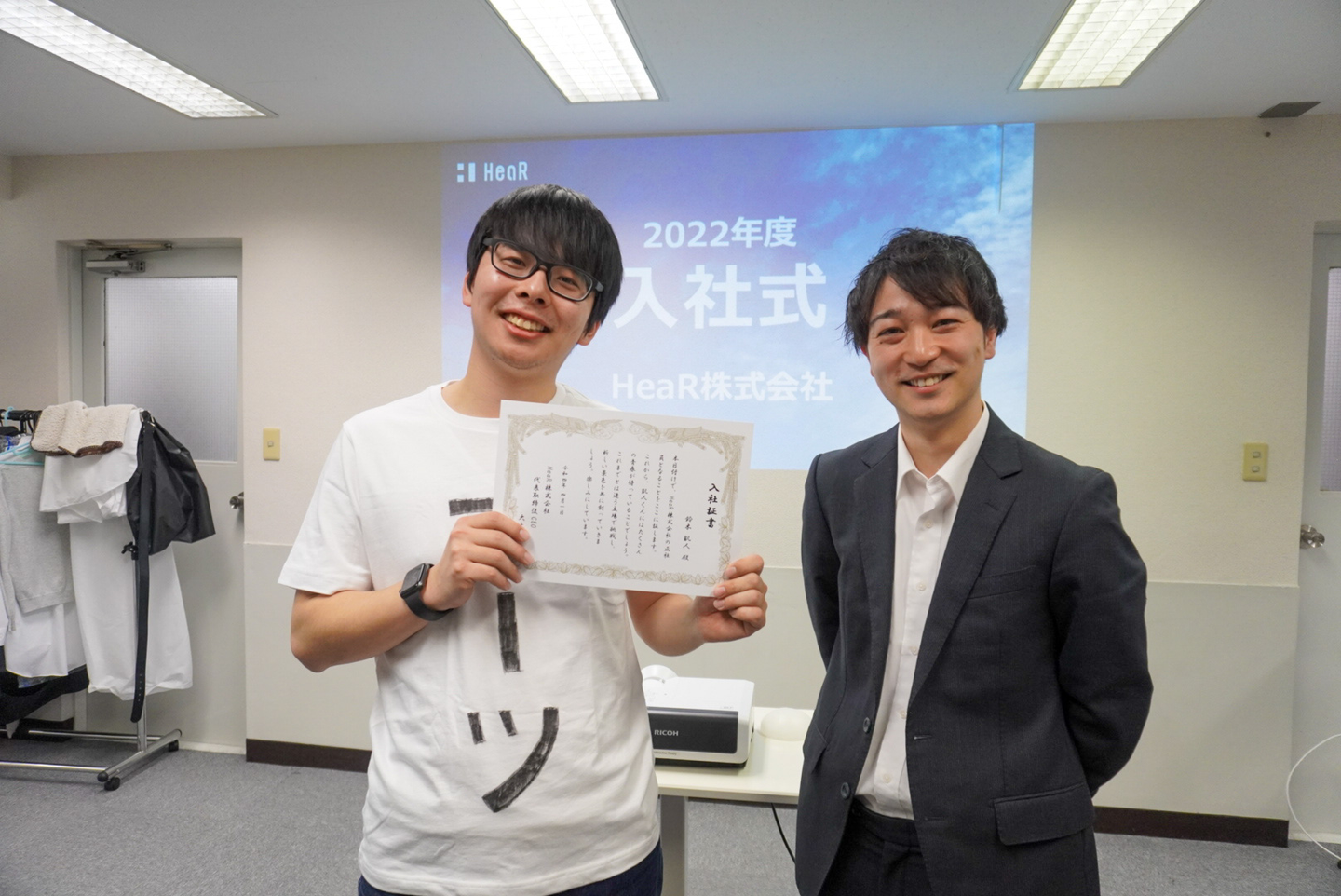 そんな4月初日。そう、4月1日はHeaR初となる入社式を行いました。新卒1期生となる鈴木くん(通称:凱人くん)がインターン生から正社員へ。思い出に残るような入社式にしたく準備をしてまいりました。