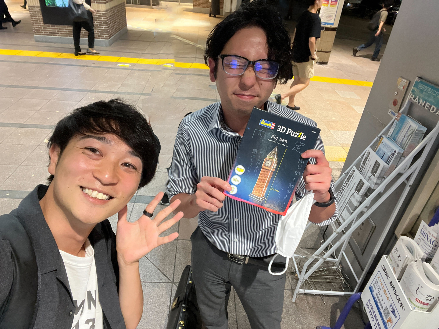 代表大上と候補者時代の西口さん(笑)。内定通知のサプライズでは、「同じ時を刻もう」とビッグ・ベンのパズルをお渡ししましたね!