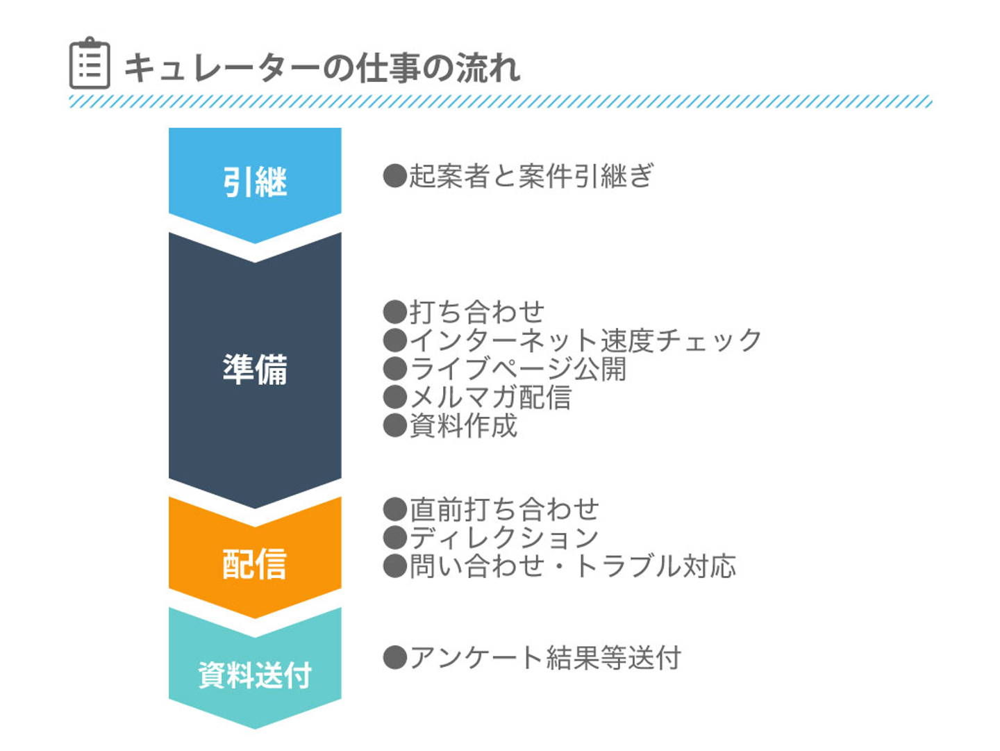 当日までメールベースでやりとりしていきます。ご依頼状などの書類提出、当日使用する機材、ケータリングについてなど細かいご要望や質問に対して回答します。