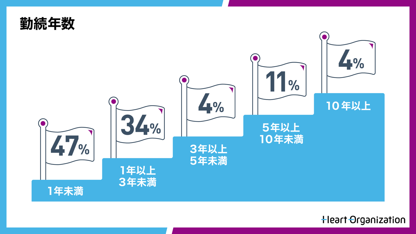 一番多いのが、1年未満で全体の約5割を占めます。2022年1月に人事担当者が当社にジョインしてから採用活動が一気に加速。1年で20人増えました。フレッシュなメンバーと共に、事業の成長を加速させていきます!