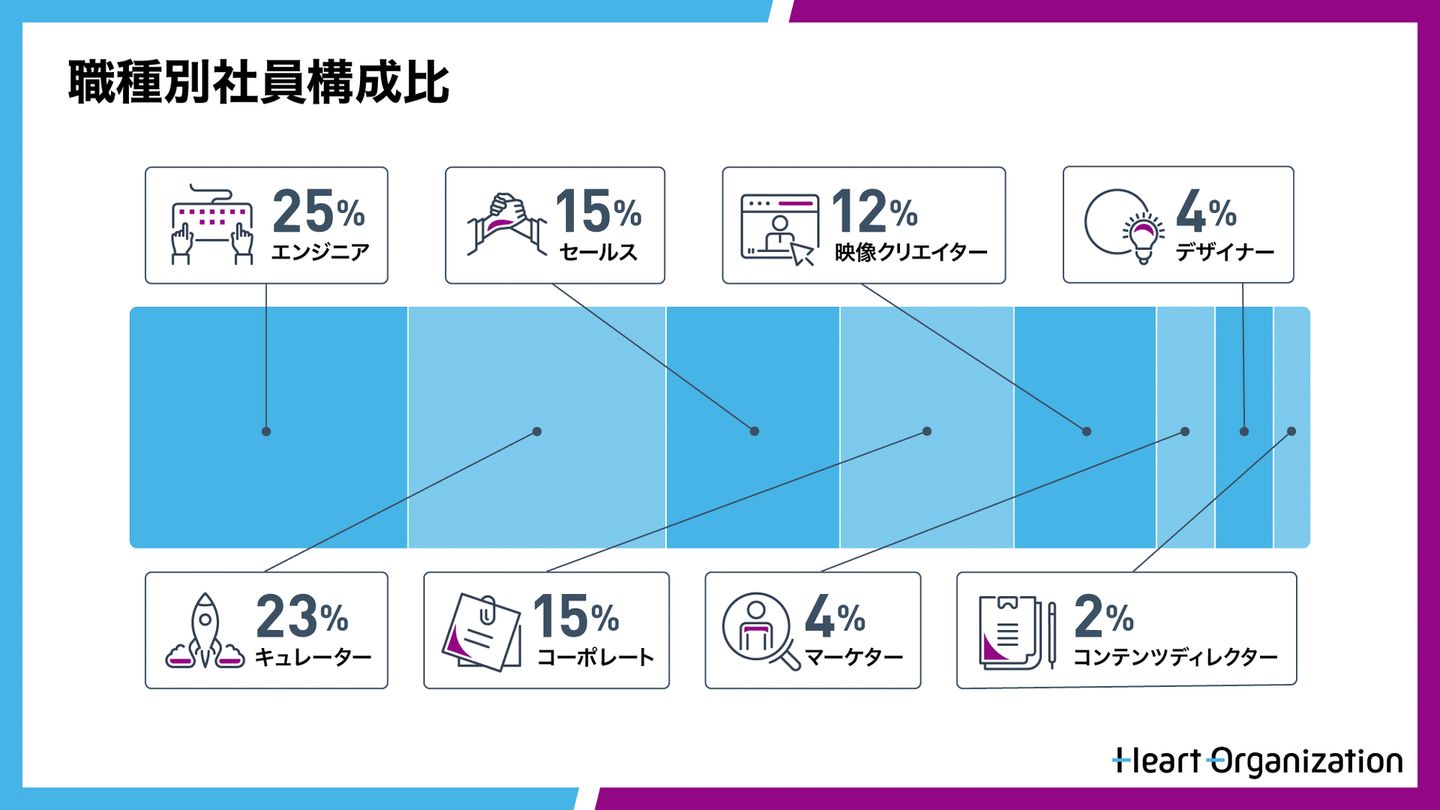 一番多いのはWebエンジニアです。次に多いのが、ライブ配信の準備・実施をリードを担当するキュレーターです。コーポレートの内訳は、経理、労務・総務、人事、薬事、情報システム、広報など、幅広い職種の人がいます。