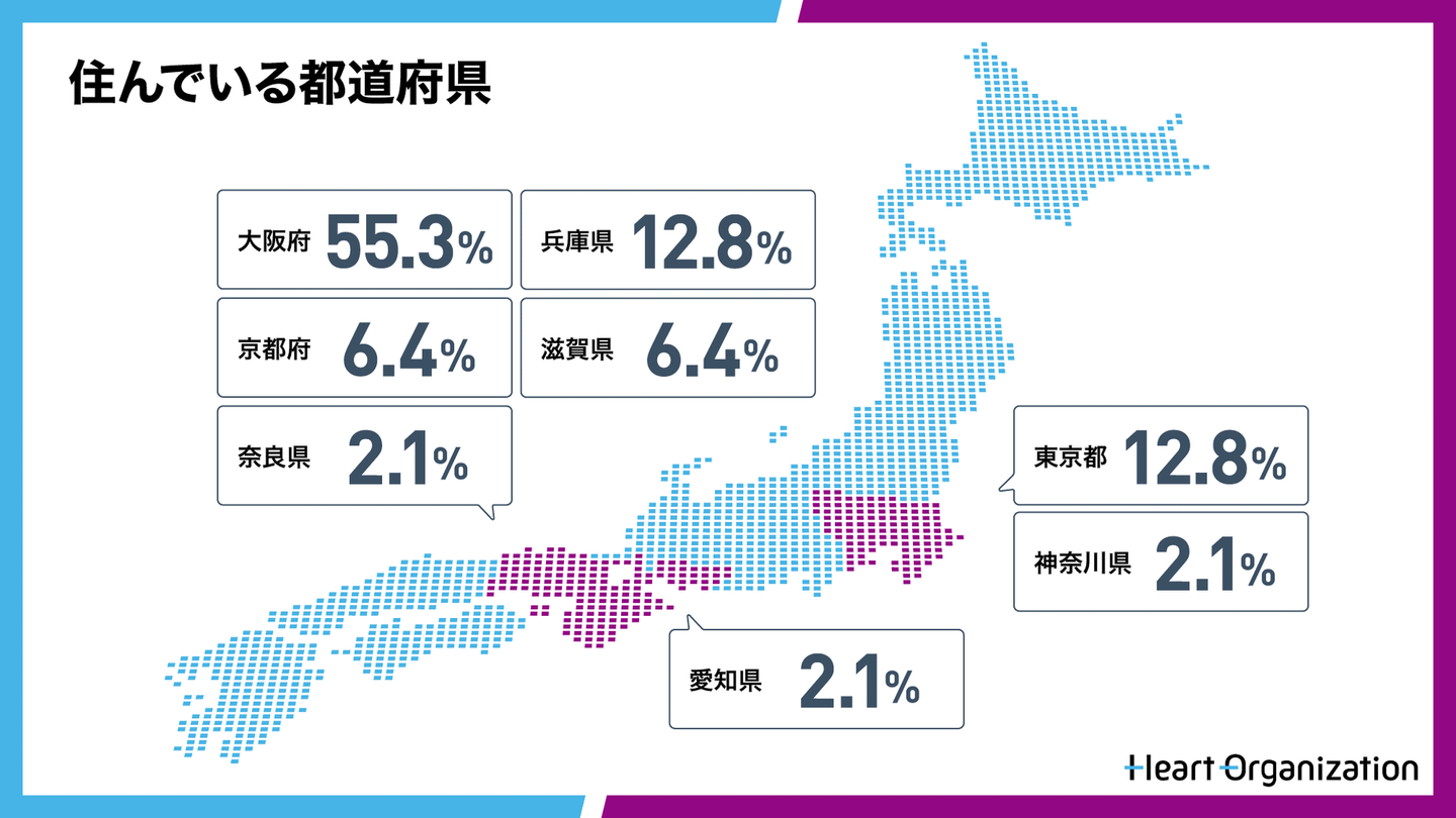 大阪に住んでいる人が5割と圧倒的に多いです。通勤可能エリアである、兵庫、京都、滋賀、奈良にも住んでいる人がいます。東京オフィス所属のメンバーは、東京都か神奈川に住んでいます。