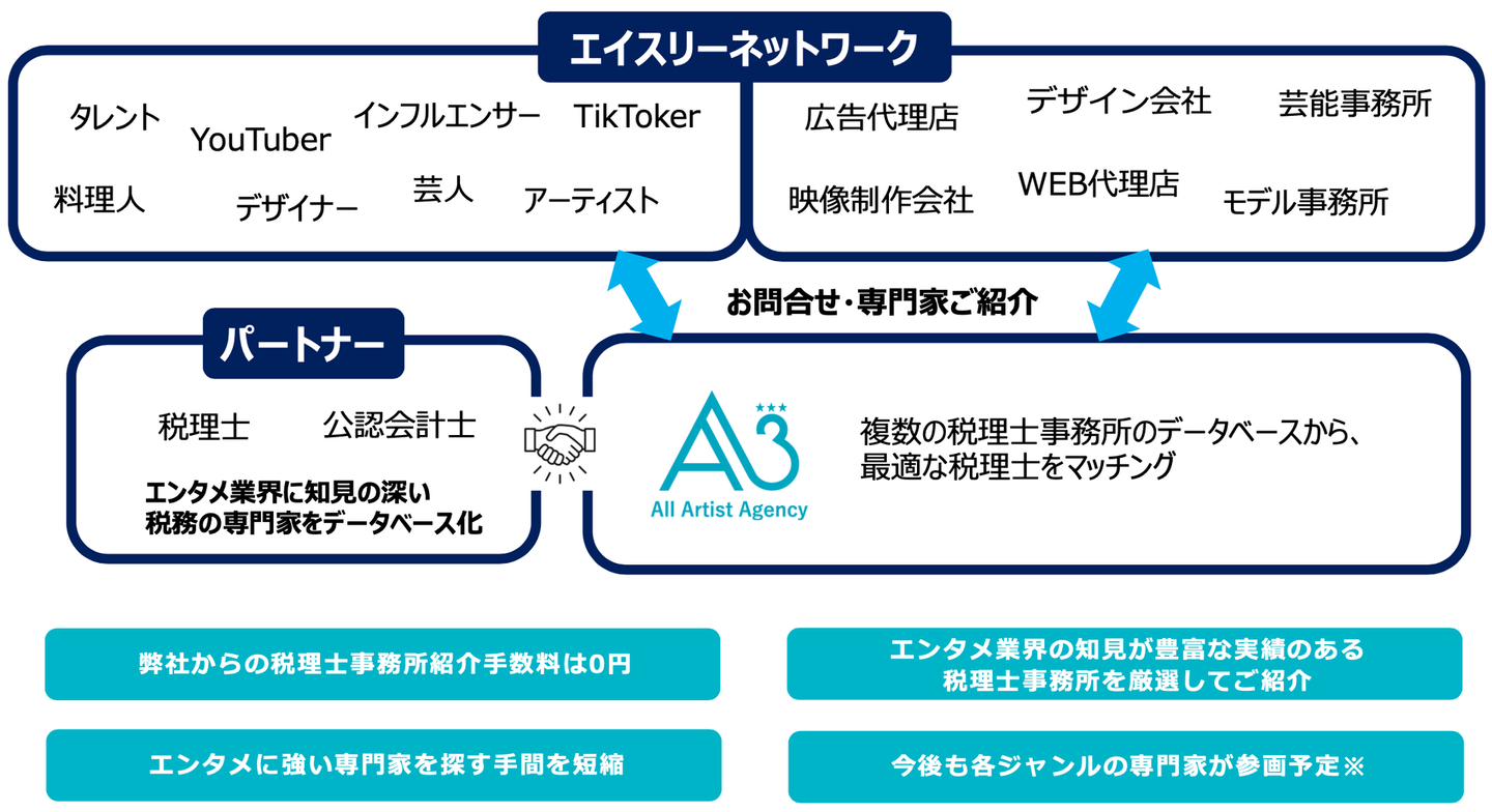 専門家マッチング支援サービス「タスケル税務」とは、各種専門家の方のアドバイスや役務提供を受けたいタレントやエンタメ企業を対象に、エイスリー独自の審査基準で厳選された士業(税理士、公認会計士)の皆様をお繋ぎするサービスです。