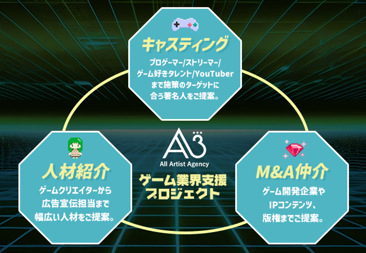 「ゲーム業界支援プロジェクト」によって、既存事業のキャスティング、人材紹介、M&A仲介のトータルでサービスを提供いたします。