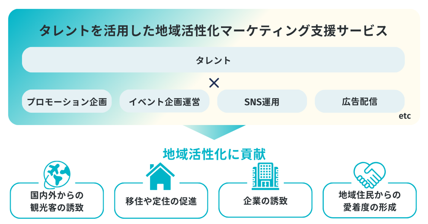 そこでタレントを活用したマーケティング支援に強みを持つエイスリーとホリプロデジタルが連携して、自治体に向けてタレント活用のマーケティングソリューションを提供することで、「国内外からの観光客の誘致」や「移住・定住の促進」、「企業の誘致」、「地域住民からの愛着度の形成」等に貢献することを目指します。