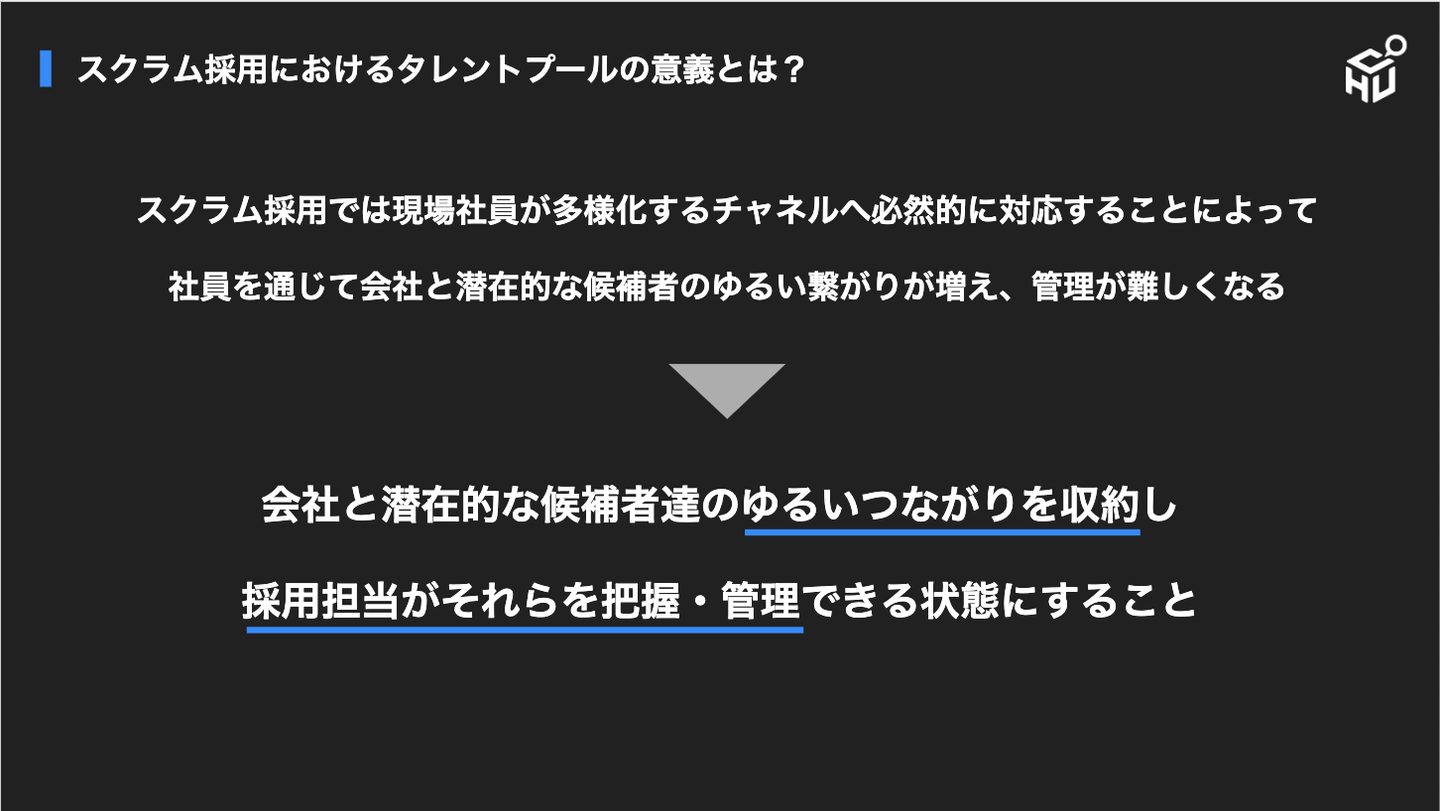 まずは、我々HERPが考えているスクラム採用におけるタレントプールの意義について徳永から共有しました。