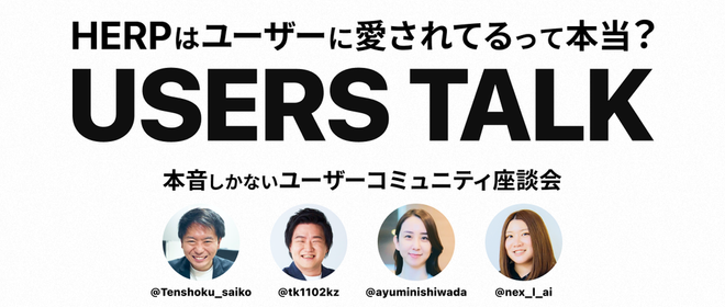 こんにちは!HERPでカスタマーサクセスを担当しております、原です。本日は先週木曜日(2019/04/11)に弊社オフィスで行った、初のユーザー会『HERP Session』の様子をお届けします!今回は13社16名の企業のみなさまにお越しいただきました♪HERP Sesseion とは?いつも弊社サービス『HERP ATS』をご利用いただいている企業の皆様に感謝の気持ちをお伝えするべく行ったイベントです!今回は初の開催で、HERP一同当日は楽しみ半分不安混じりでドキドキでした。。!当日のアジェンダは以下の通りです!乾杯,テーブルごとに自己紹介 19:00-19:15さいきんのHERP 1...