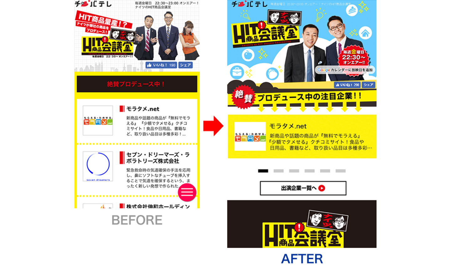 さらに、当社のサービスで番組公式サイトをリニューアルさせて頂くということで、既存サイトがとても使いにくく、特にスマホサイトが古くて使いにくい仕様になっていました。現状の課題から企業の特集ページへの導線を再構築したり、フリックでメニューが動いたりと、より使いやすい構成に変更しました。