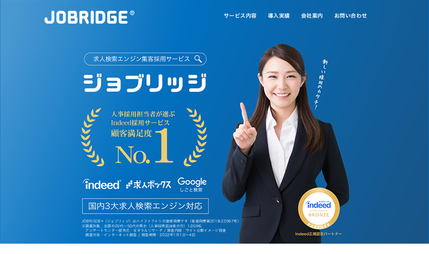 また、JOBRIGDE®(ジョブリッジ)サービスが、『人事採用担当者が選ぶIndeedサービス顧客満足度』でナンバーワンを獲得することが出来ました。