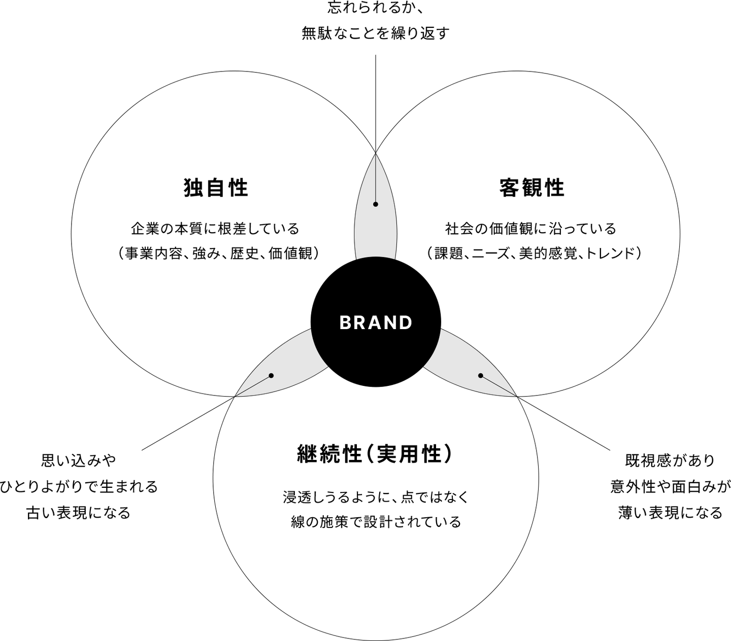 そして、ブランド表現には以下の図のとおり満たすべき必要要件があります。それが、「独自性」「客観性」「継続性(実用性)」の3つです。