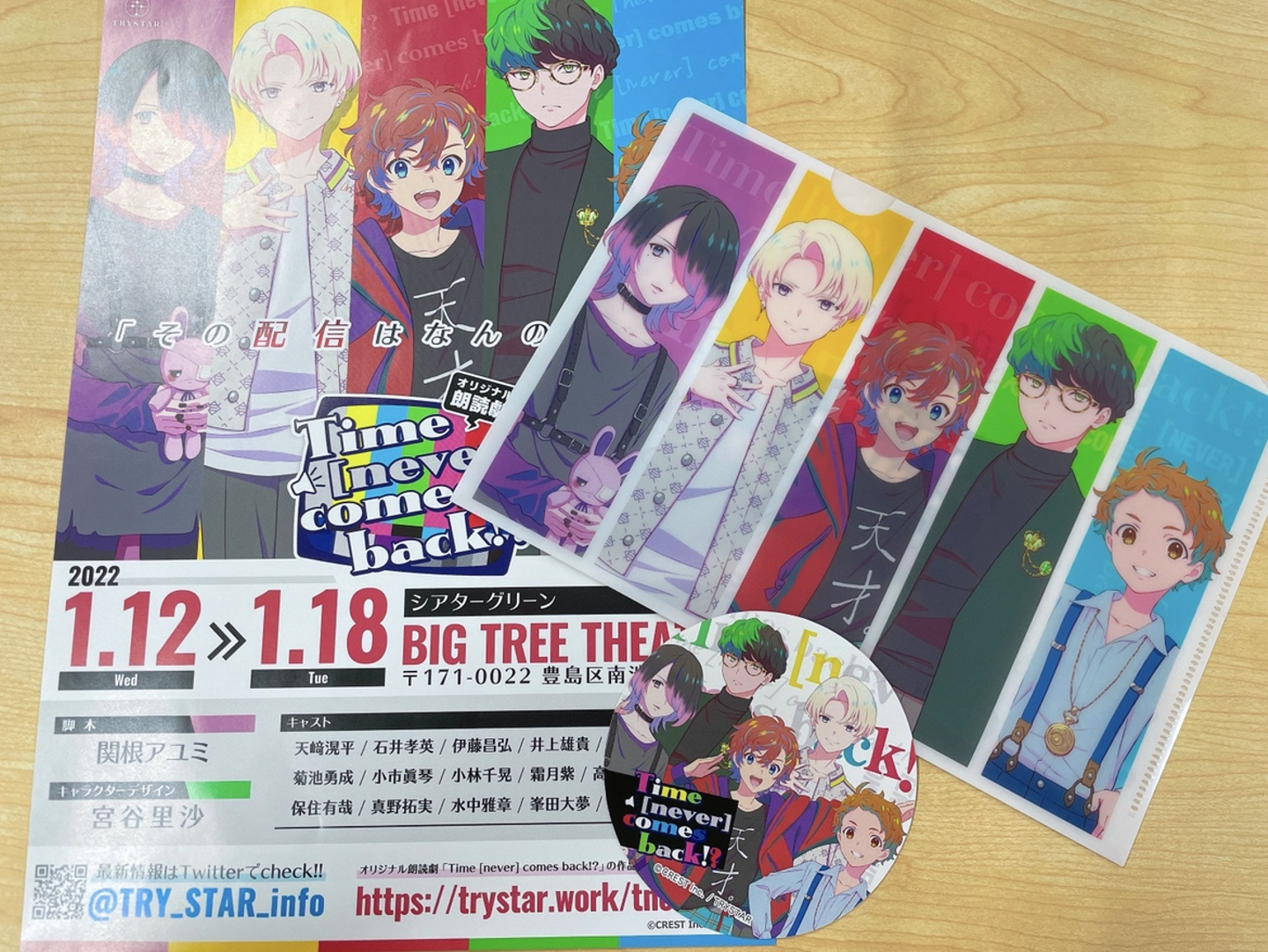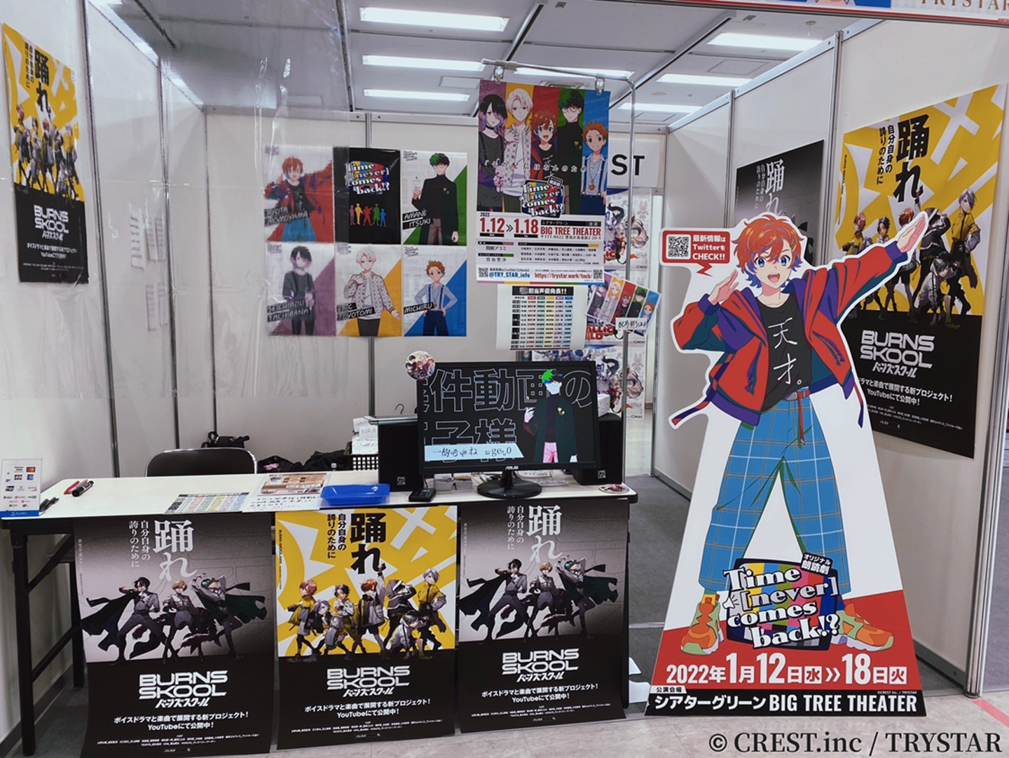 今回TRYSTARのブースでは、オリジナル朗読劇「Time [never] comes back!?」の最速先行チケットの販売をメインとし、音楽コンテンツ「BURNS SKOOL-バーンズスクール-」のグッズも一部販売を行いました。