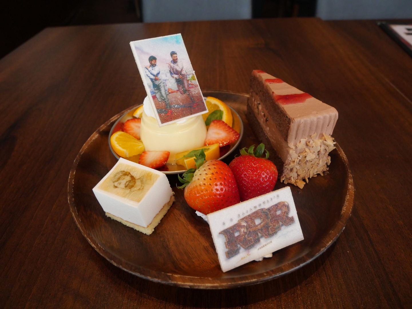 「ラーマ少年の成長の証」と題されたチョコケーキは、ラーマが初めて銃を使用し、的のド真ん中に当て父親に立派な銃使いであることを証明したシーンの的をイメージ、指名手配されたラッチュが描かれたケーキと、揺らすと2人がぷるぷる踊るナートゥプリンを選びました。