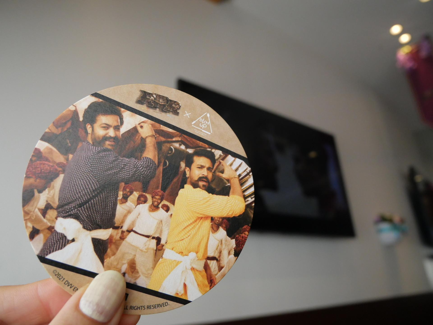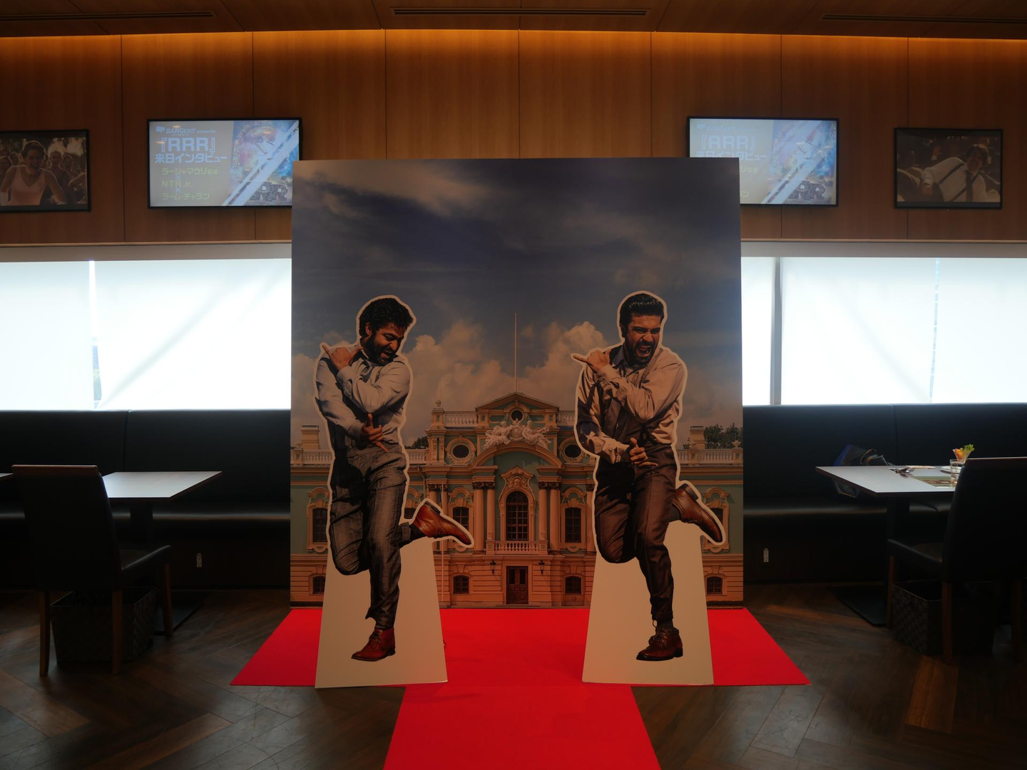 店内ではエントランス同様、パーティ会場を連想させるお花の装飾だけでなく、お城の前でナートゥダンスを踊る2人のパネルがあったり、“INDIA’S BIGGEST BLOCKBUSTER(インドの大傑作!)”と共にバイクに乗って楽しく談笑する2人が壁一面に描かれていたり、ファンであればきっと「このシーンめちゃ好きやねん〜」と唸るような仕掛けがいくつかありました。実際にレストランにいた人は皆店内を見てニヤニヤしたり、一緒に写真を撮ったりしていたので、ファンの心をグッと掴んでいた様子、グッジョブ(だから誰なの)