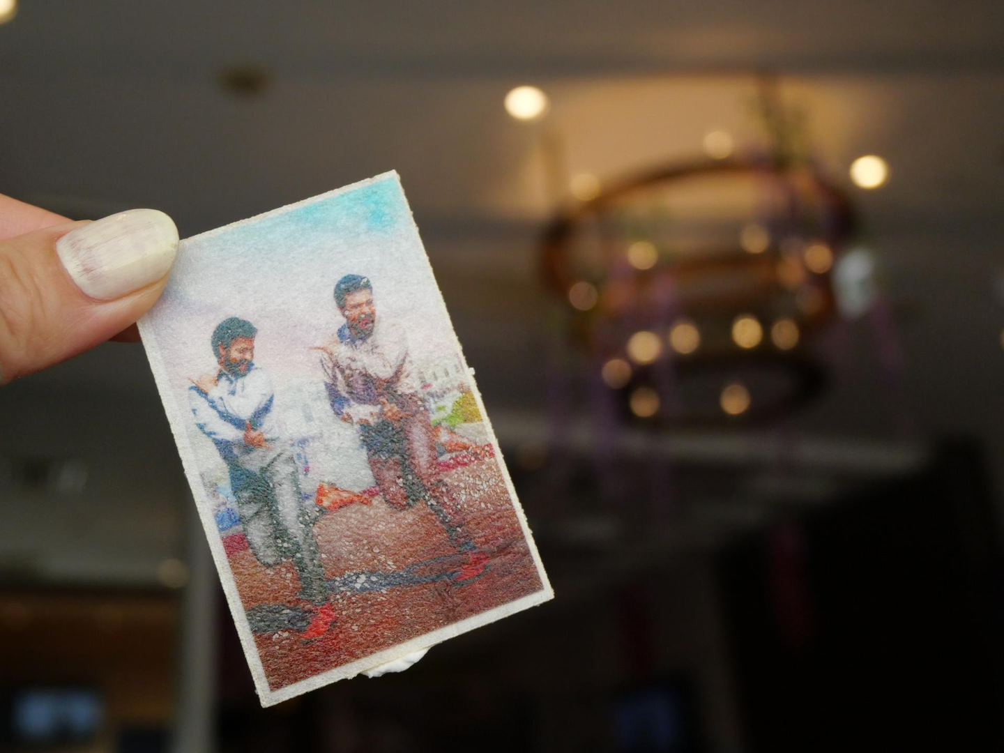 デザートについてきた2人の絵をメインにパシャリ。インスタでよく見かけるやつ。でも背景がよくわからないので、結果よくわからない写真になりました。