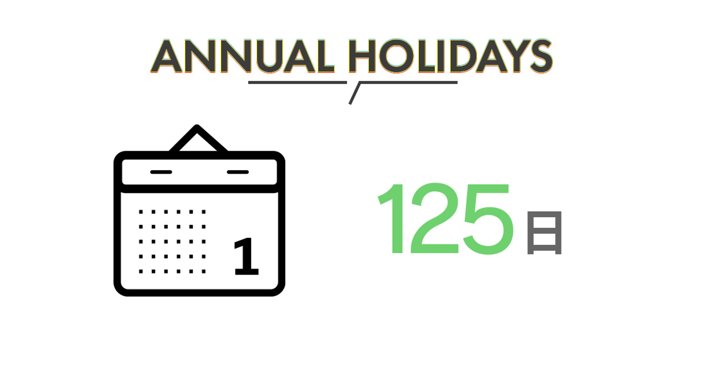 年間休日は125日以上。土日祝日・年末年始を休日とする完全週休2日制です。それに加え有給休暇・夏休み休暇が別途付与され、プライベートの時間をきちんと確保できます。