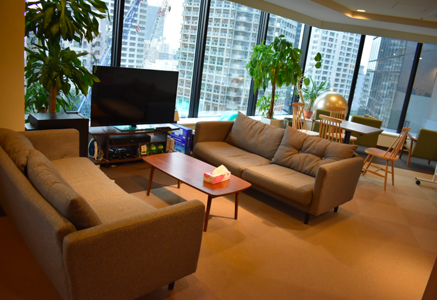 オフィスの半分を占めているここは家のリビングのようで、ミーティングに使ったり、ソファーに座りながら仕事をしたり、自由に使っています。仕事終わりにはテレビゲームも楽しめます。