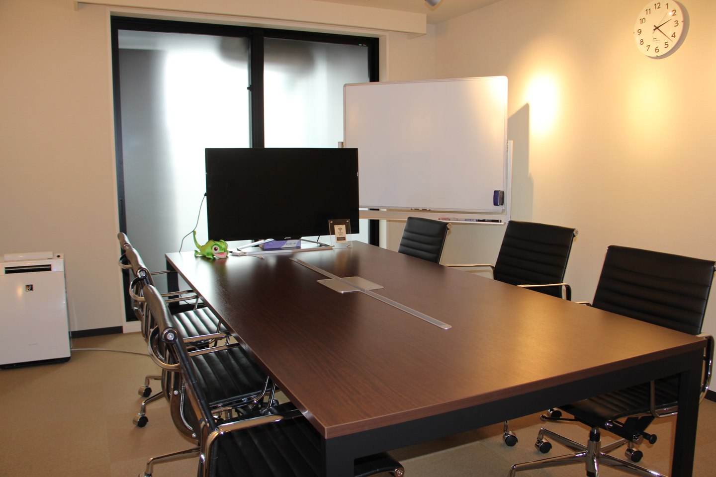 カフェスペースとは違う印象で重厚感ある会議室です。来客時に使われています。