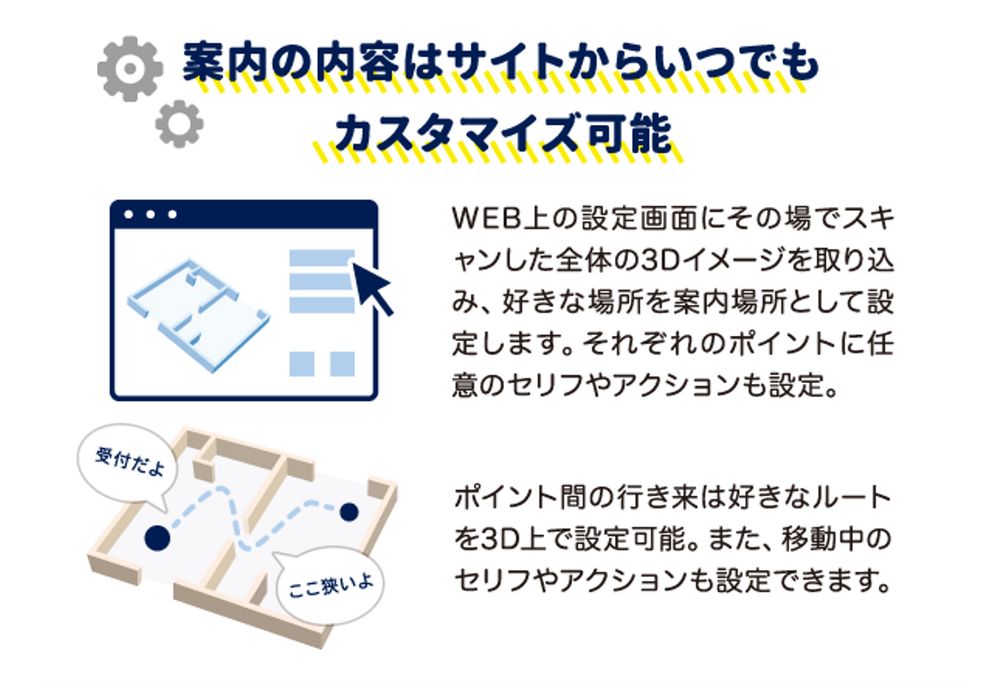 特定の現実空間(商業施設、美術館など)や、特定の場面(工場見学、会社案内など)に対して、Web上の設定画面から案内させたい地点や内容を設定することで、任意のキャラクターが現実空間を案内してくれます。