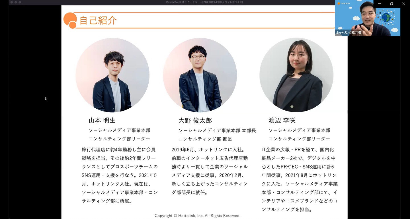 2022年2月に、採用イベント「SNSコンサル・代理店への転職体験談を共有します!」を開催しました。人事担当の松井さんが司会を務め、ホットリンクへ中途入社したSNSコンサルタント3名が、自身の経験を語りました。