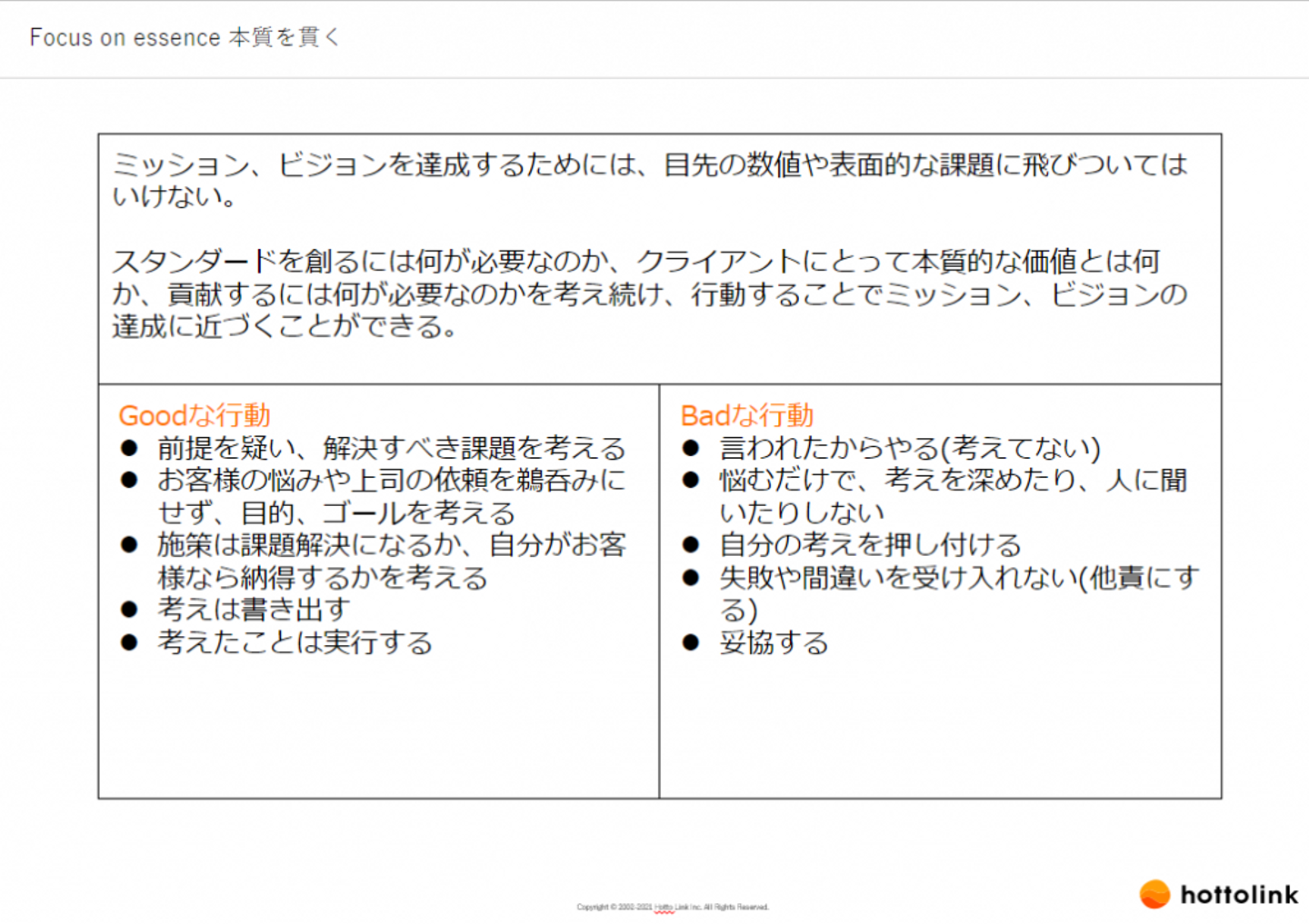 ホットリンクが掲げる5つのバリューのうちのひとつ。「本質を貫く」という意味が込められており、具体的には下記のような行動指針となっています(画像参照)。