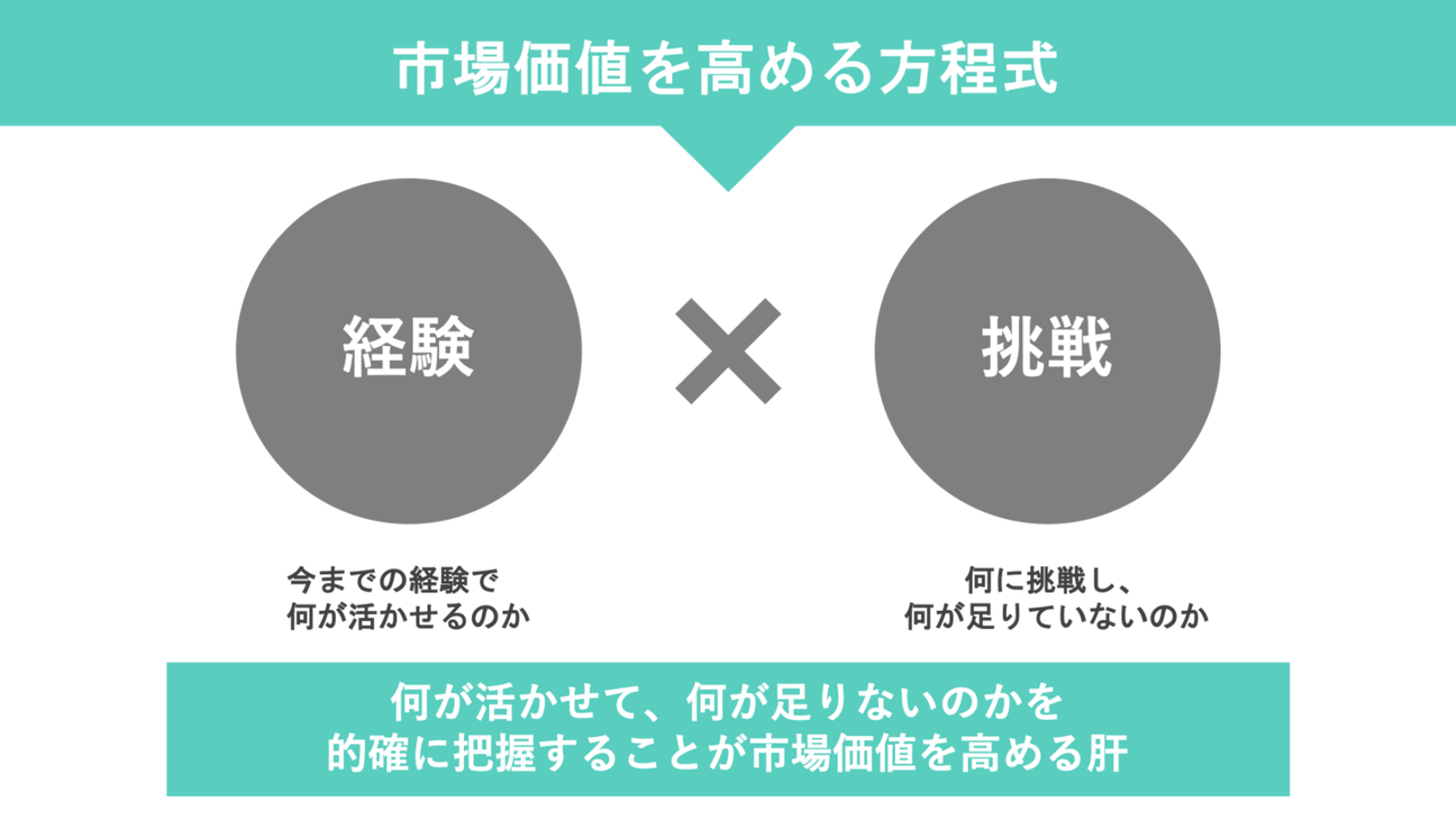 「経験と挑戦の掛け算」が市場価値を高める方程式だと考えています。自分自身の価値を高めるためには、できることを広げたり尖らせたりすることが必要不可欠。しかもできる人が少ないニッチな領域であればなおさらです。