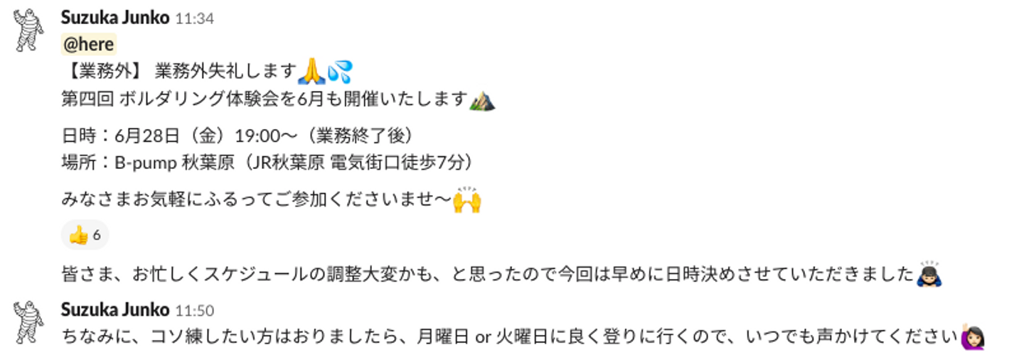 プロダクトグループは根が真面目で超優秀な方々ばかりなのですが、そんな人達が声上げて笑ってくれるとめっちゃ嬉しいです。もっと笑わせたいと思っちゃいます(笑)先日のボルダリング体験会は代表の針山さんもきてくれて感動しました!