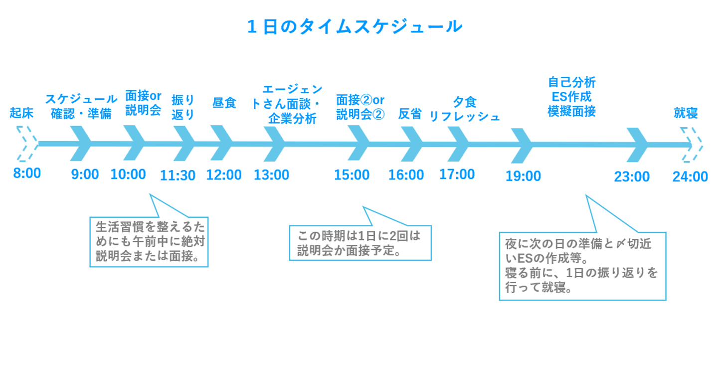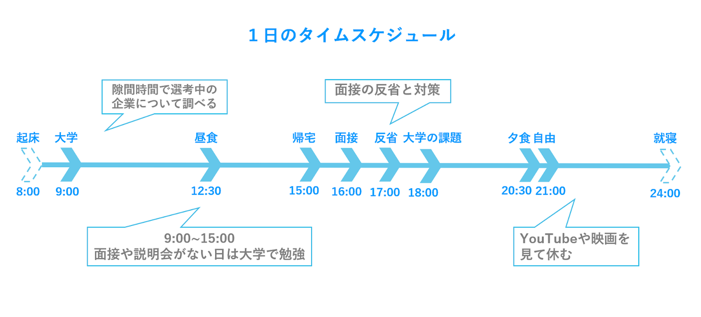 僕自身、「とにかく行動」というのをテーマに就活をやっていて、予定を詰め込みすぎて凄くきつい思いをした時もあったので、適度にリフレッシュを挟むことも大切だと思います。