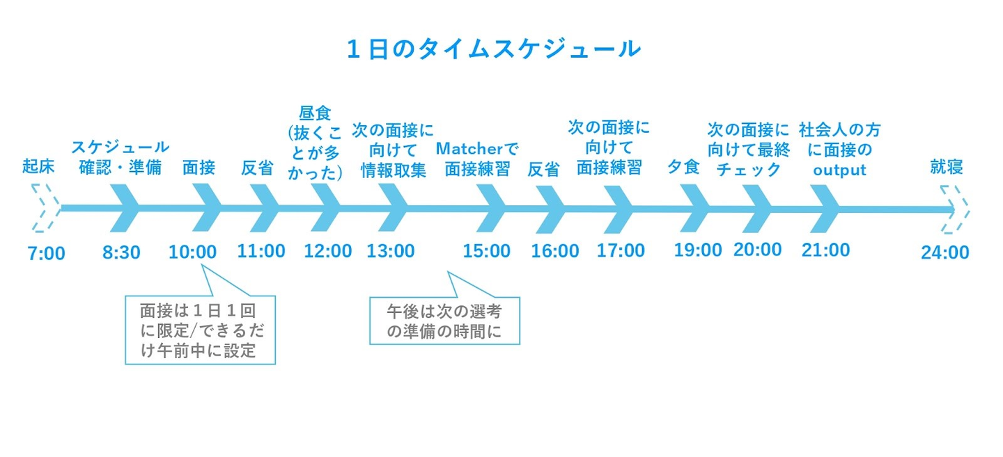 山 本:私は教員か民間企業に就職するかで迷っていて、比較したかったこともあり、教育実習前の大学3年の6月にスタートして、4年の6月に終わりました。就活中に2つ教育実習があったので、教育実習と就活、それぞれメリハリをつけて過ごしていました。1日のスケジュールでよかったところは、睡眠時間をできるだけ確保していたところです。私の場合は、7時間睡眠を確保できているかどうかが、パフォーマンスに大きく影響してくるので、就寝時間と起床時間をできるだけ固定しました。一方で、もっとこうすればよかったなと思ったところは、食事についてです。タスクに集中しすぎて食事を抜いて作業してしまった結果、体力が持たなかったり、集中力が切れたりと体調面であまりよくありませんでした。なので、改善点としては、食事の時間をスケジュールに必ず入れることですね。リフレッシュの時間があることで、午後からも集中できたり、次の日も頑張れたりするので、これからも意識していきたいですね。 ※タイムスケジュール表の"Matcher"とは…OB訪問機能とスカウト機能を兼ね備えた就活プラットフォーム