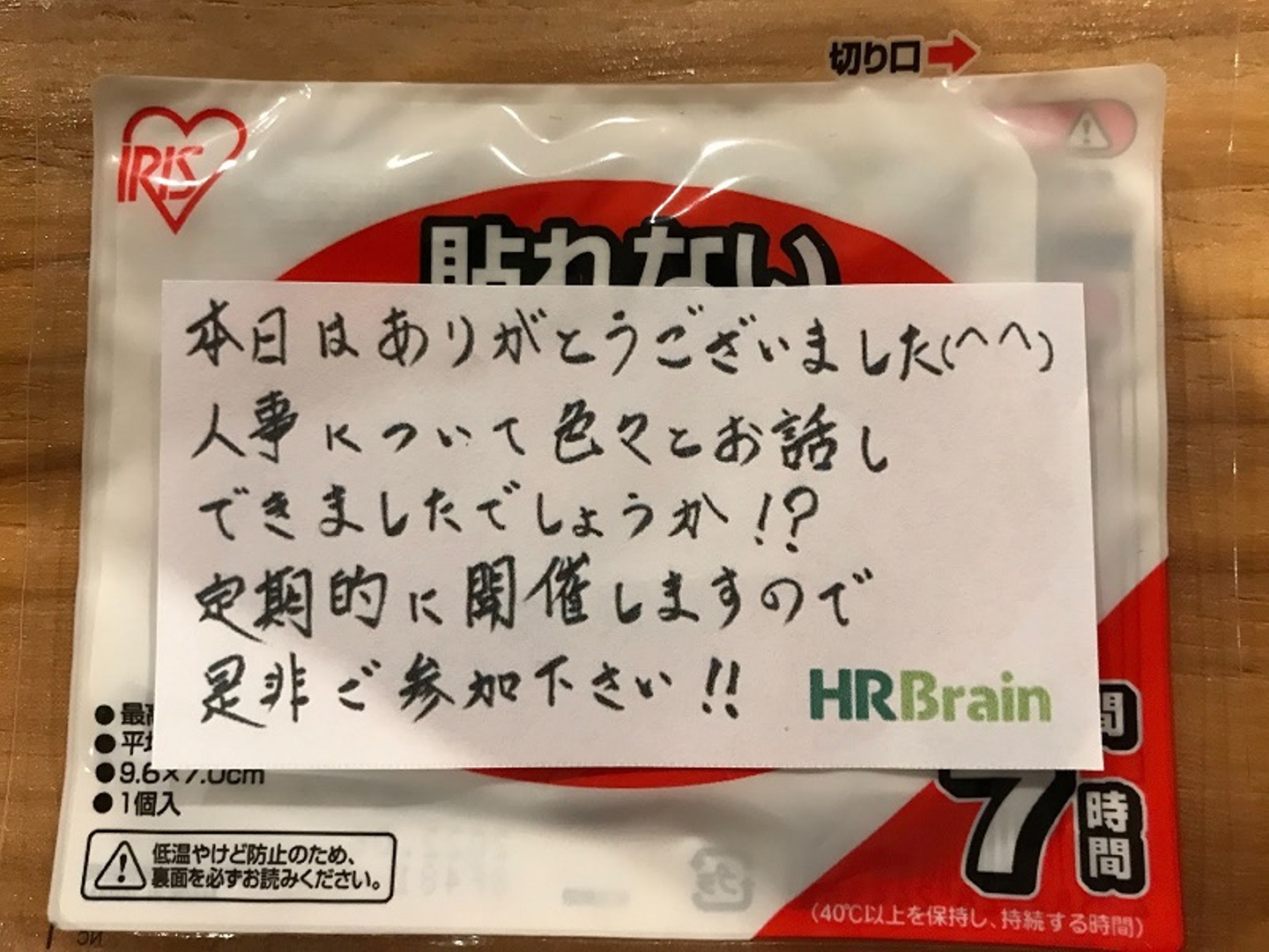 完全に余談ですが、開催日はまだ2月頭というもあって、夜は特に冷え込む予想だったので、帰宅中に手を暖めて頂きつつHRBrainのことも思い返して頂くきっかけになればと「メッセージ付きホッカイロ」を作成し、解散時に皆さまへお配りしました。弊社カスタマーサクセス担当渾身のメッセージ付きカイロだったのですが、その日はかなり気温が高く、参加者全員が今日はカイロは利用しないという結果となり、皆様にはこの状態でお持ち帰り頂きました。残念でした。