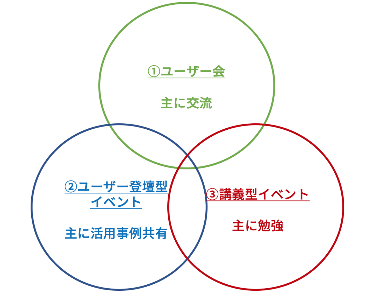 まずは開催者側のユーザー会含むイベント実施目的を明確にしました。今後、HRBrainコミュニティを構築していく上で、現状3種類のオフラインイベントの実施を検討しており、今回は①として実施しました。