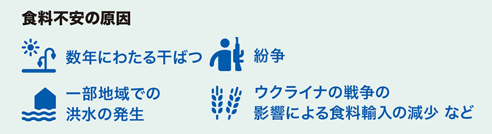 世界規模での食料不安の深刻化は、各地で長引く紛争をはじめ、以下のような要因が考えられます。