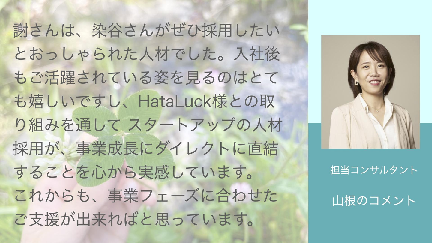 ヒューマンシップ経由で多くの人材を採用いただいており、担当者の山根は,エージェントながら「人事部長」と呼んでいただいているほど。なぜそこまで信頼を置いていただいているのか。代表取締役CEO 染谷剛史さんと、ヒューマンシップを介してHataLuck and Person様にご入社された謝心悦さんにお話を伺いました。