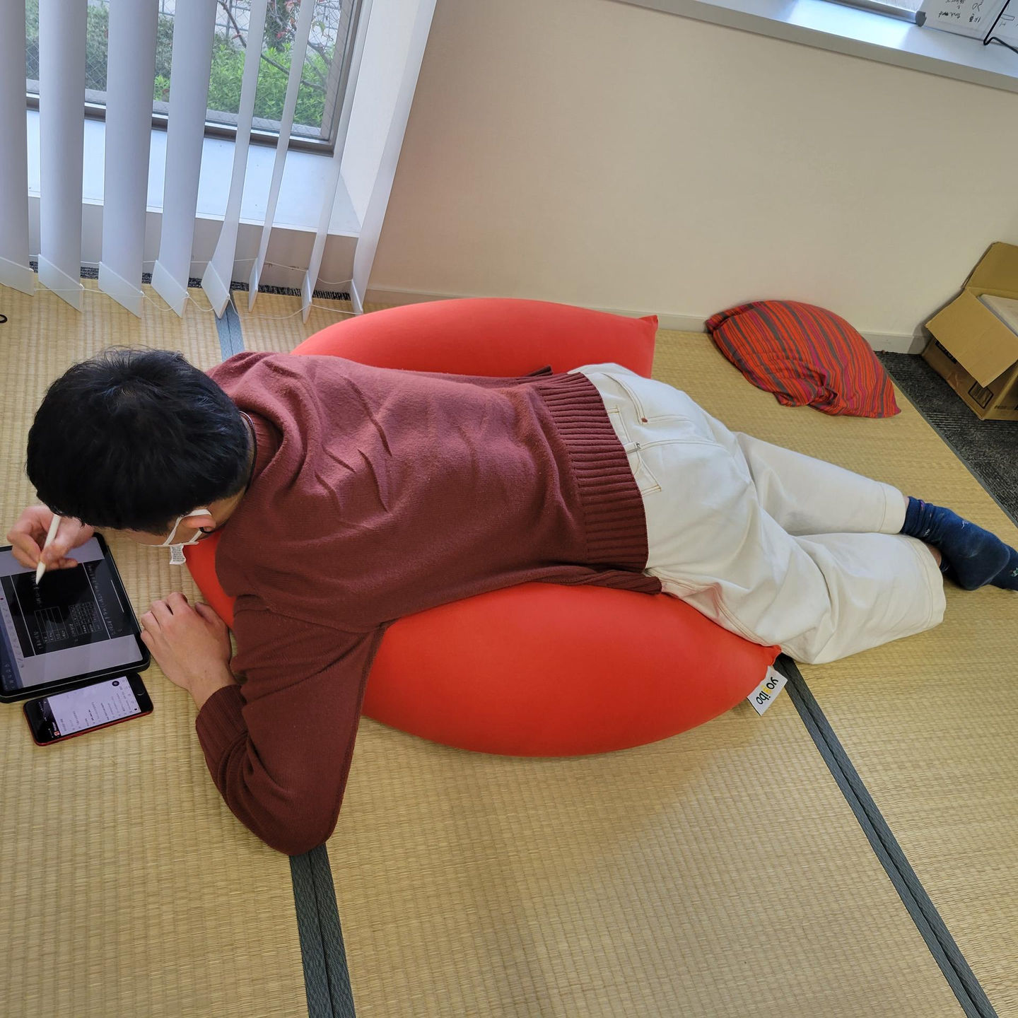 クリエイティブな発想には、気分転換が重要ですよね。フツパーのオフィスは土足厳禁、どこでも仕事してOK、畳スペースや健康器具もあって、気分転換できる環境があります。