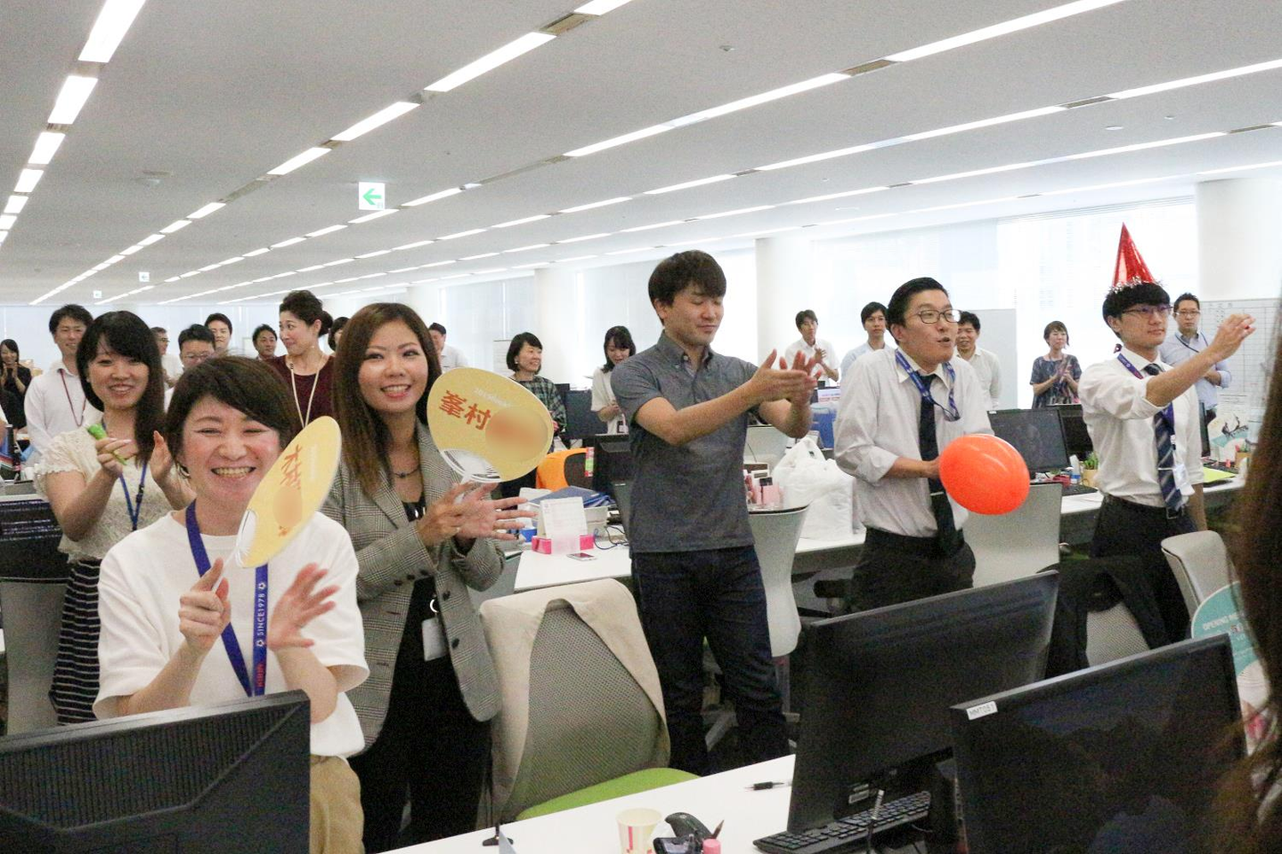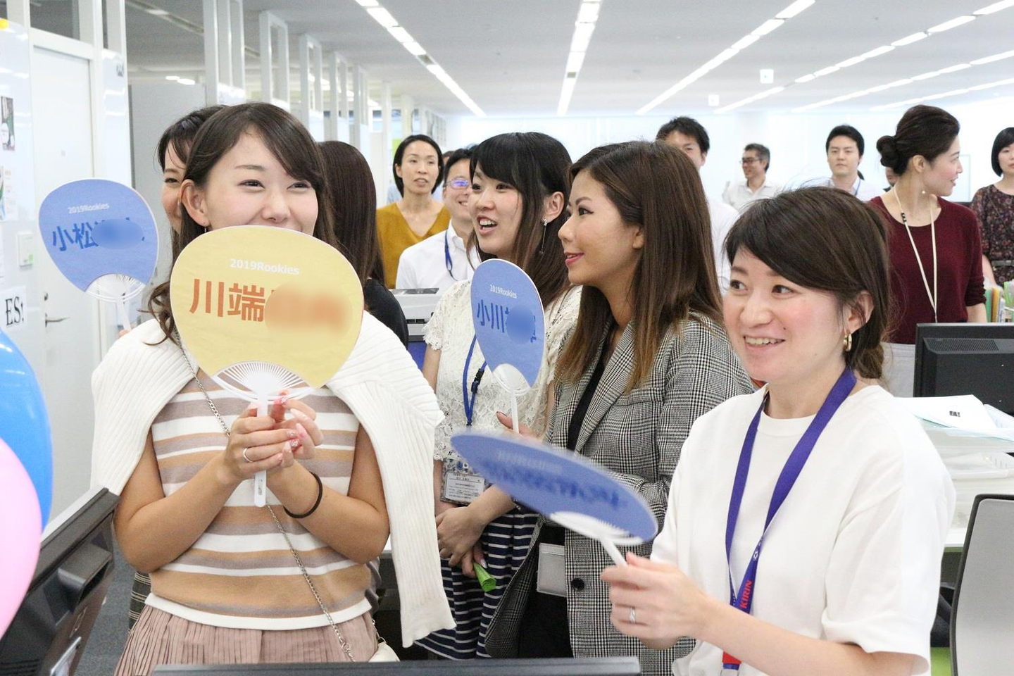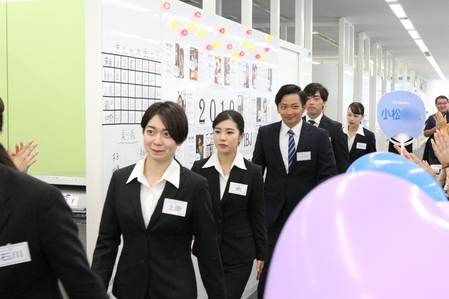 うちわや横断幕など、歓迎ムード漂う中、新卒たちが登場!
