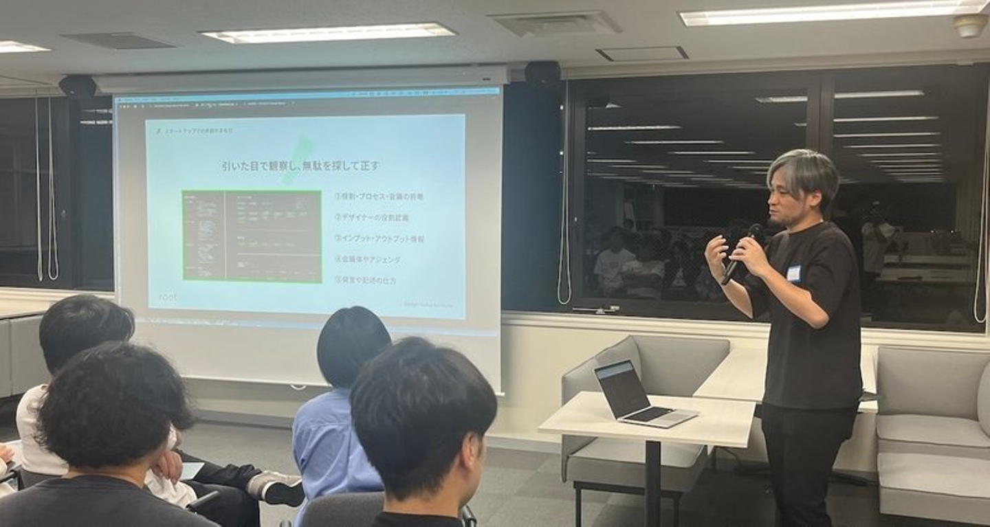最後は弊社DPM(デザインプログラムマネージャー) 岸 良平よりお話しさせて頂きました。事業成長を実現するために他職種との共創において工夫している点について、rootならではの取り組み内容をお話ししました。内容は、「スタートアップでの共創のまなび」。