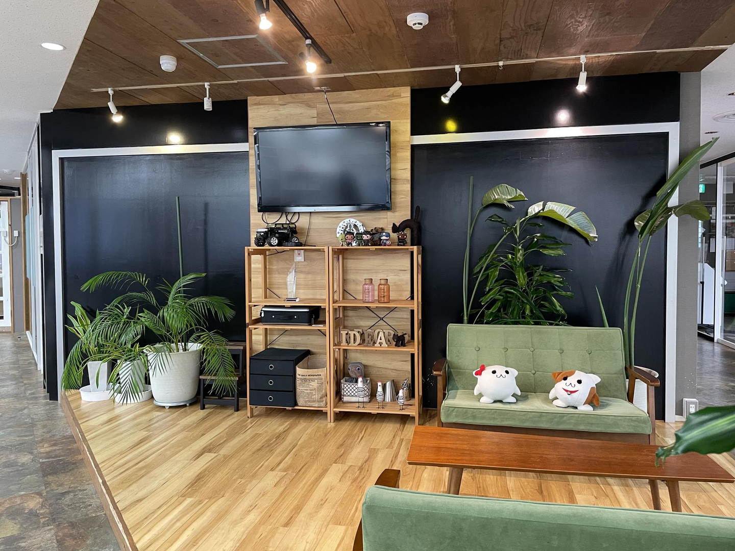 ウッドテイストでデザインされたラウンジです。社員が一同に会する月次社員会議やショートMTGなどもここで開催します。お昼休みの時間帯にはみんなでランチをしたり、歓迎会などでの利用もしています。