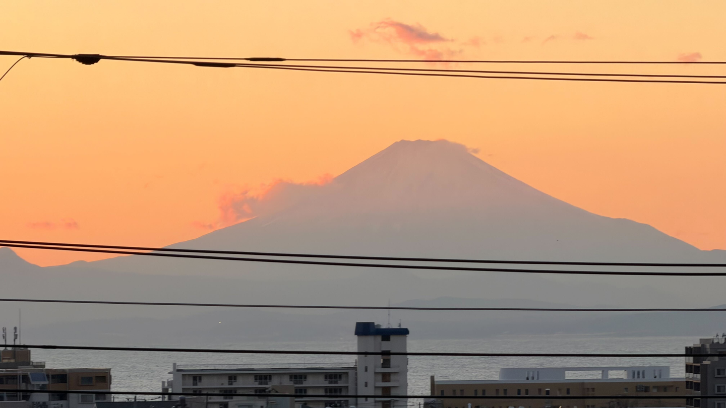 夕方になると、2階からは葉山の海に沈みゆく夕日と、その向こうに浮かぶ富士山の姿が見え始めました。集合時間になっても、なかなか1階に降りてこない——