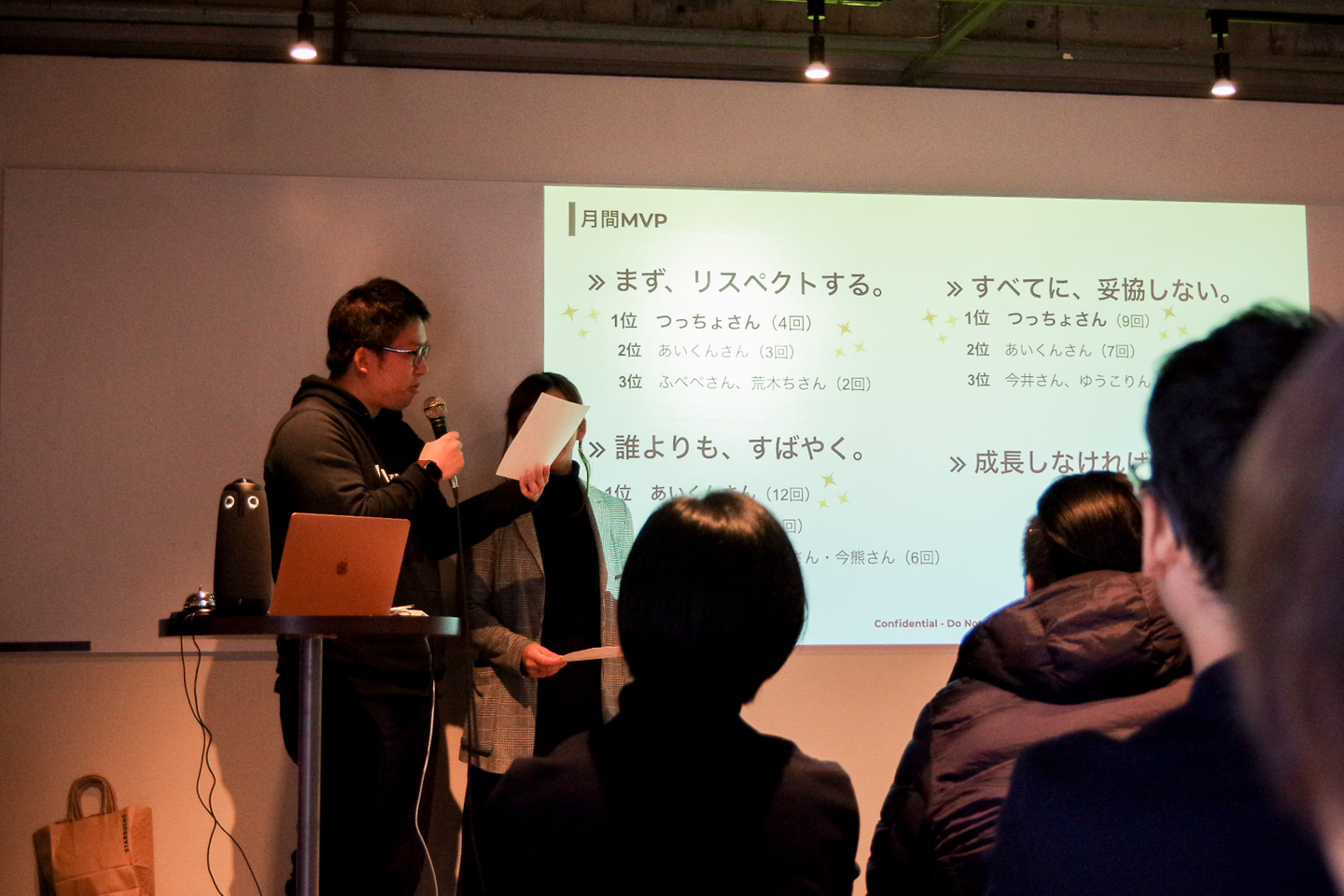 新入社員の紹介から始まり、各ディビジョンの担当者からのOKR進捗の共有、そして最もイジゲンのバリューを体現した社員に対する表彰などが行われました。各バリューのトップを代表取締役の鶴岡が獲得し、自分自身で表彰状を読み上げる姿はとてもシュールでした。しかし「代表がバリュー体現してるのは当たり前だ」という社員の想いをくみ取り、来月から役員陣は表彰対象者から外れるという大きな意思決定がなされました。どこまでもボトムアップな組織です。