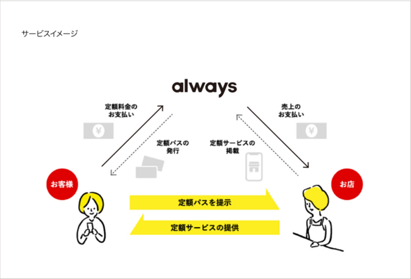 alwaysはOMO型サブスクリプションサービスで、alwaysに掲載されている定額サービスを購入し、購入後は実際にお店に行き会員証を提示することで、そのサービスを受けることができます。