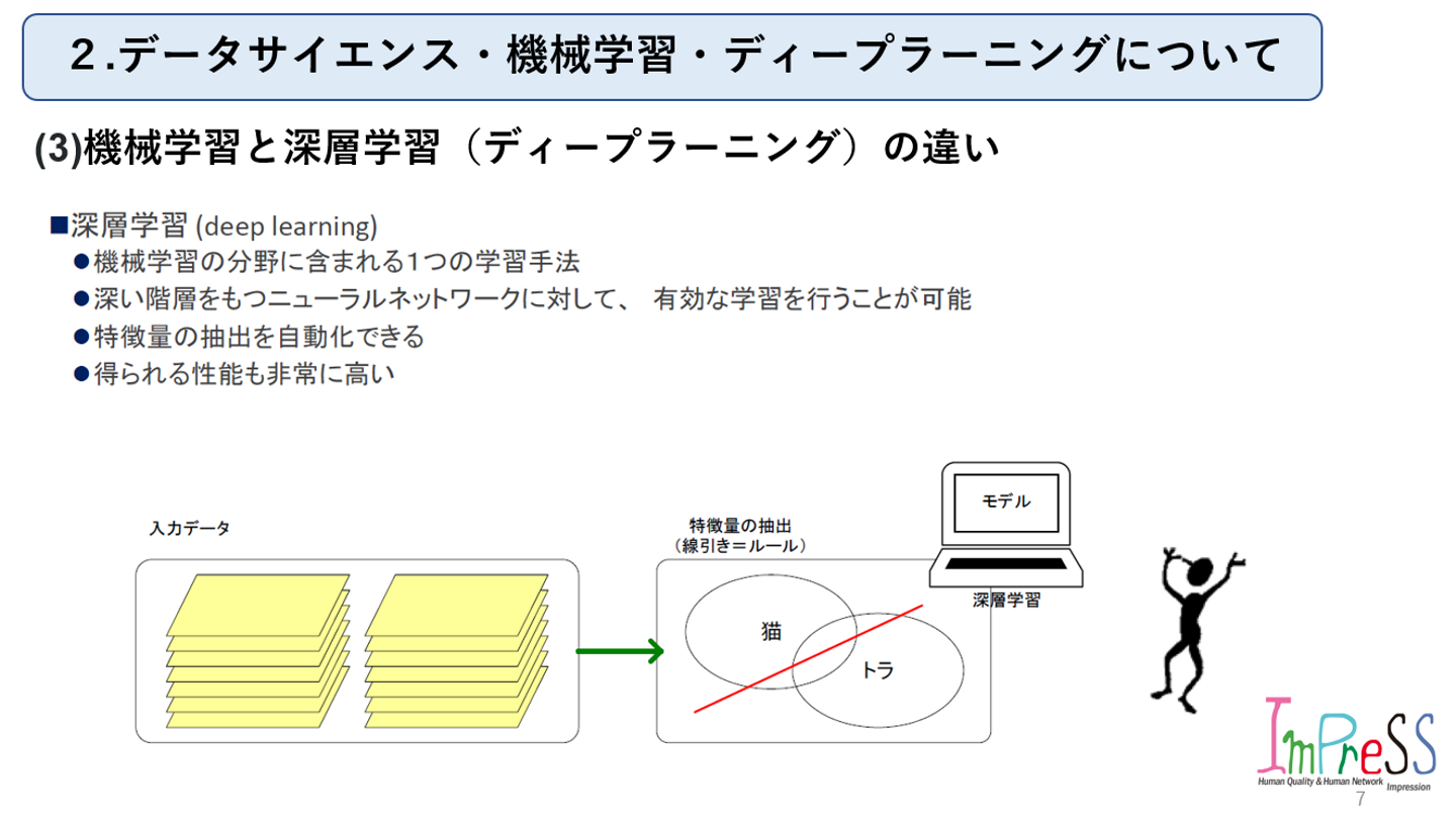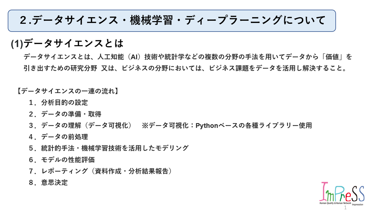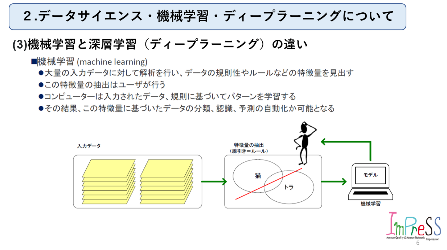 株式会社インプレスFollowhttp://www.imprex.co.jp大阪府FollowHomeAbout usMembersStoriesJob postings AI 事業推進グループ主催 第2回勉強会 中川 護 西日本事業部・AI事業推進グループリーダー on 2022-11-27 ★今回から本題に入っていきます!内容は以下の通りです。良ければ見ていって下さい。(1) データサイエンスとは(2) 機械学習とは(3) 機械学習と深層学習(ディープラーニング)の違い 株式会社インプレス's job postings AI 事業推進グループ主催 第2回勉強会 中川 護 株式会社インプレス / 西日本事業部・AI事業推進グループリーダー 2 Likes Share 2 Likes