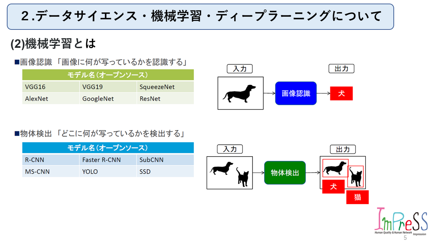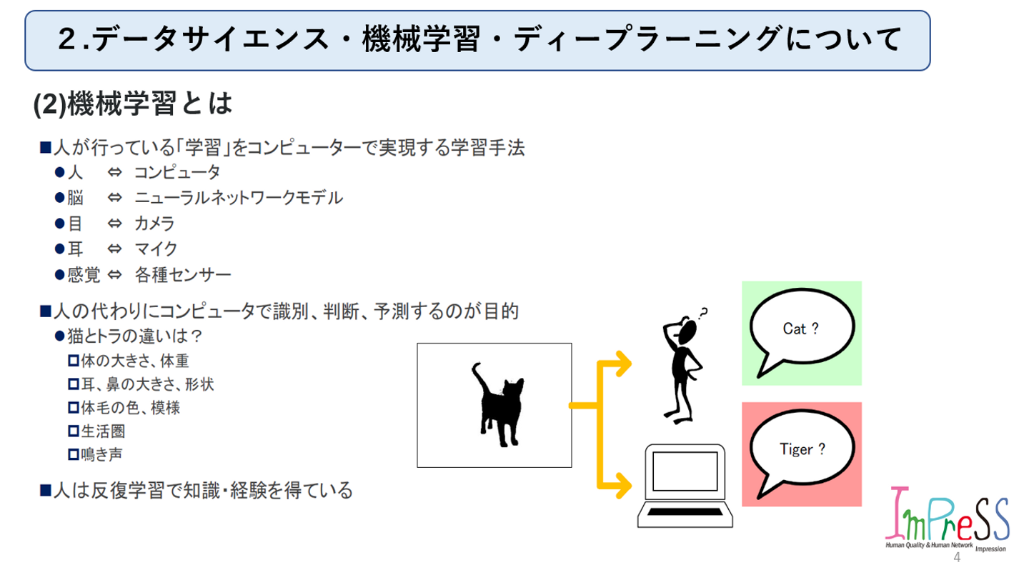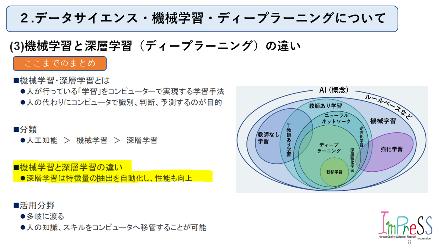 株式会社インプレスFollowhttp://www.imprex.co.jp大阪府FollowHomeAbout usMembersStoriesJob postings AI 事業推進グループ主催 第2回勉強会 中川 護 西日本事業部・AI事業推進グループリーダー on 2022-11-27 ★今回から本題に入っていきます!内容は以下の通りです。良ければ見ていって下さい。(1) データサイエンスとは(2) 機械学習とは(3) 機械学習と深層学習(ディープラーニング)の違い 株式会社インプレス's job postings AI 事業推進グループ主催 第2回勉強会 中川 護 株式会社インプレス / 西日本事業部・AI事業推進グループリーダー 2 Likes Share 2 Likes