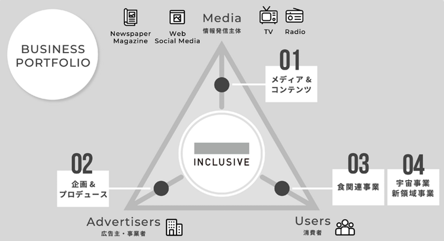 2007年創業以来、出版社、テレビ局をはじめとしたメディア企業や事業会社のデジタルトランスフォーメーションを推進してきたINCLUSIVEは「コミュニケーション」を主軸とし、デジタルメディア関連事業、食関連事業、人工衛星データ活用事業などを展開しています。