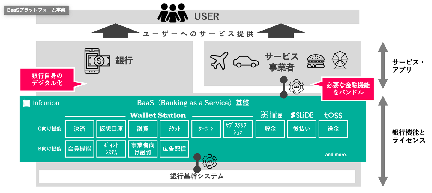 (図1)インフキュリオンが提供するBaaSプラットフォームイメージ ※銀行が提供する各種サービスをAPIで各企業のアプリなどに連携し、アプリ上で銀行サービスを利用できるようにするもの