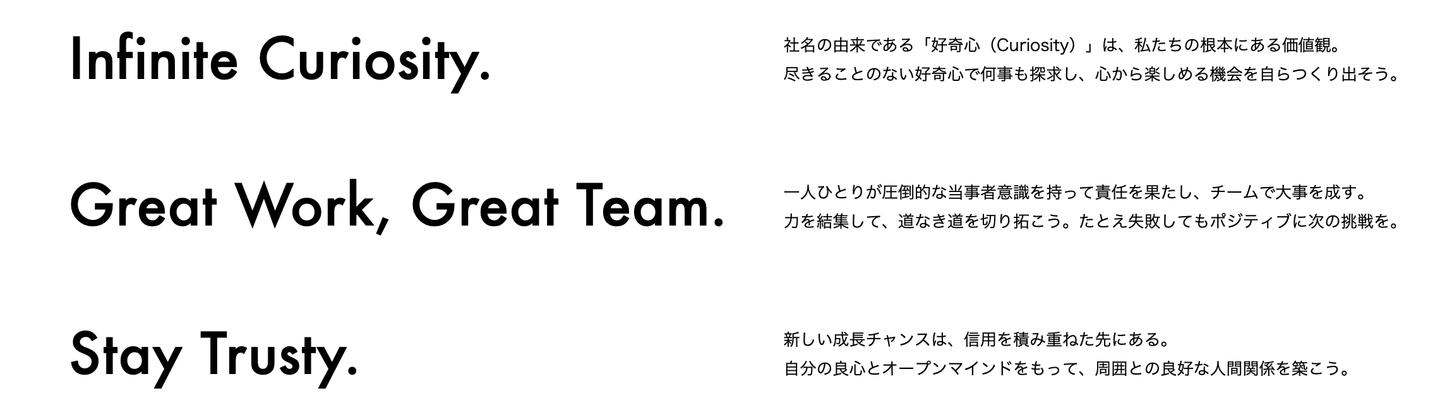当社では、(下の図の通り)3つのバリューを掲げています。当社のビジネスを成立させるには、ビジネスアイデアやデザイン、マーケティング戦略、財務、政府との対話など、さまざまな要素が必須です。いろんな立場のプロが集まってはじめてできるビジネスなので、このバリューを大切にしています。